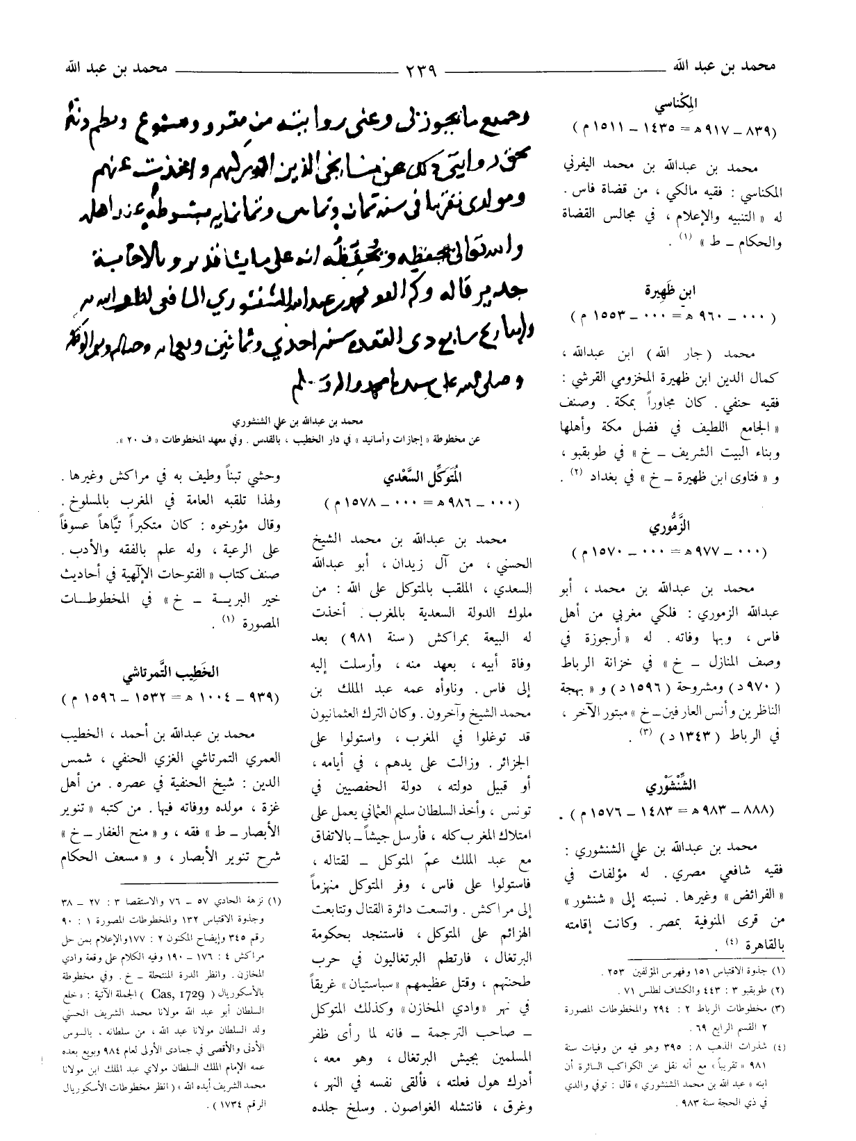 (1) نزهة الحادي 57 - 76 والاستقصا 3: 27 - 38 وجذوة الاقتباس 132 والمخطوطات المصورة 1: 90 رقم 345 وإيضاح المكنون 2: 177 والإعلام بمن حل مراكش 4: 176 - 190 وفيه الكلام على وقعة وادي المخازن. وانظر الدرة المنتحلة - خ. وفي مخطوطة بالأسكوريال (Cas 1729) الجملة الآتية: (خلع السلطان أبو عبد الله مولانا محمد الشريف الحسني ولد السلطان مولانا عبد الله، من سلطانه، بالسوس الأدنى والأقصى في جمادى الأولى لعام 984 وبويع بعده عمه الإمام الملك السلطان مولاي عبد الملك ابن مولانا محمد الشريف أيده الله) (انظر مخطوطات الاسكوريال الرقم 1734) .