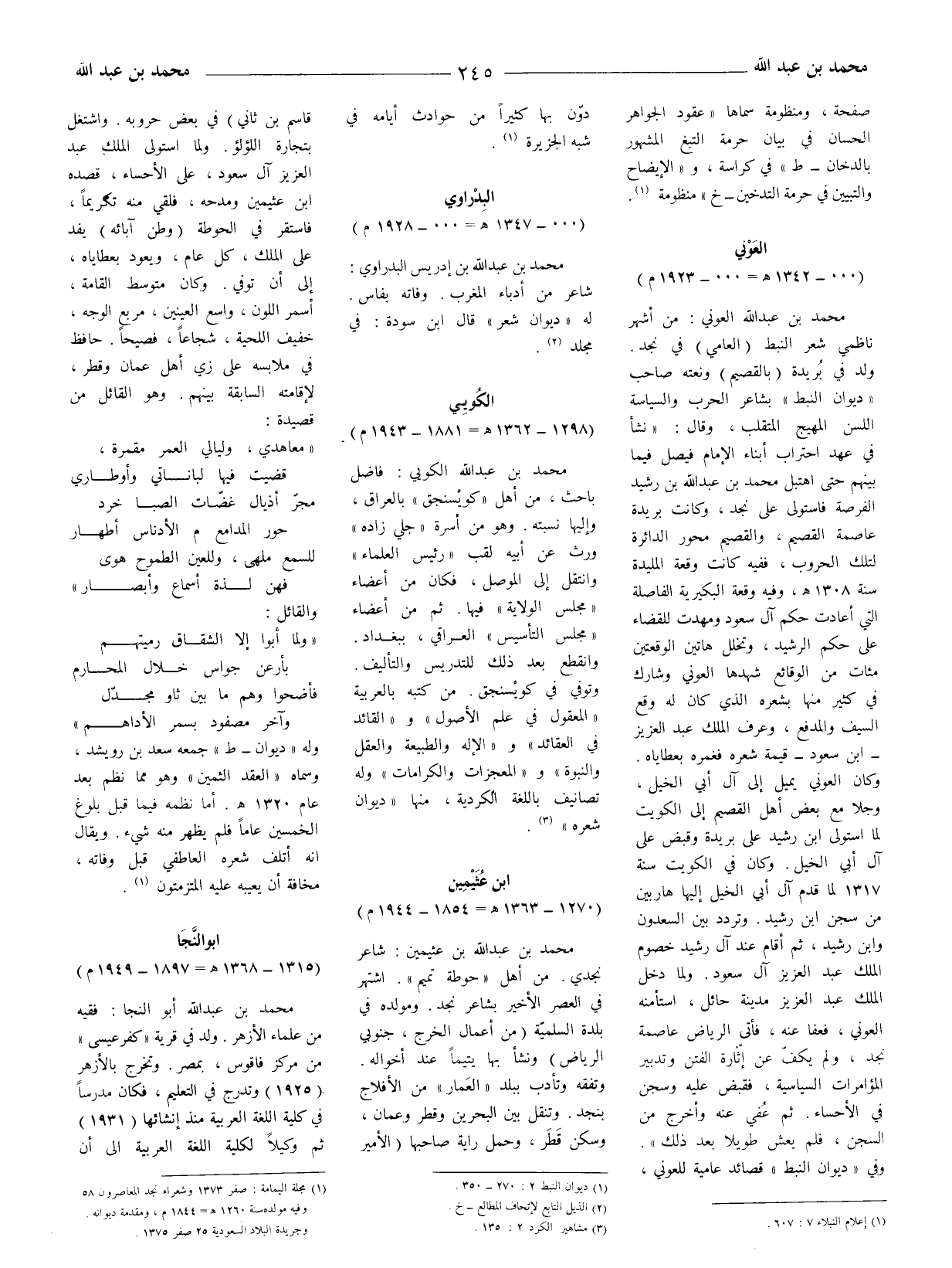 (1) مجلة القيامة: صفر 1373 وشعراء نجد المعاصرون 58 وفيه مولده سنة 1260 هـ = 1844 م، ومقدمة ديوانه. وجريدة البلاد السعودية 25 صفر 1375.