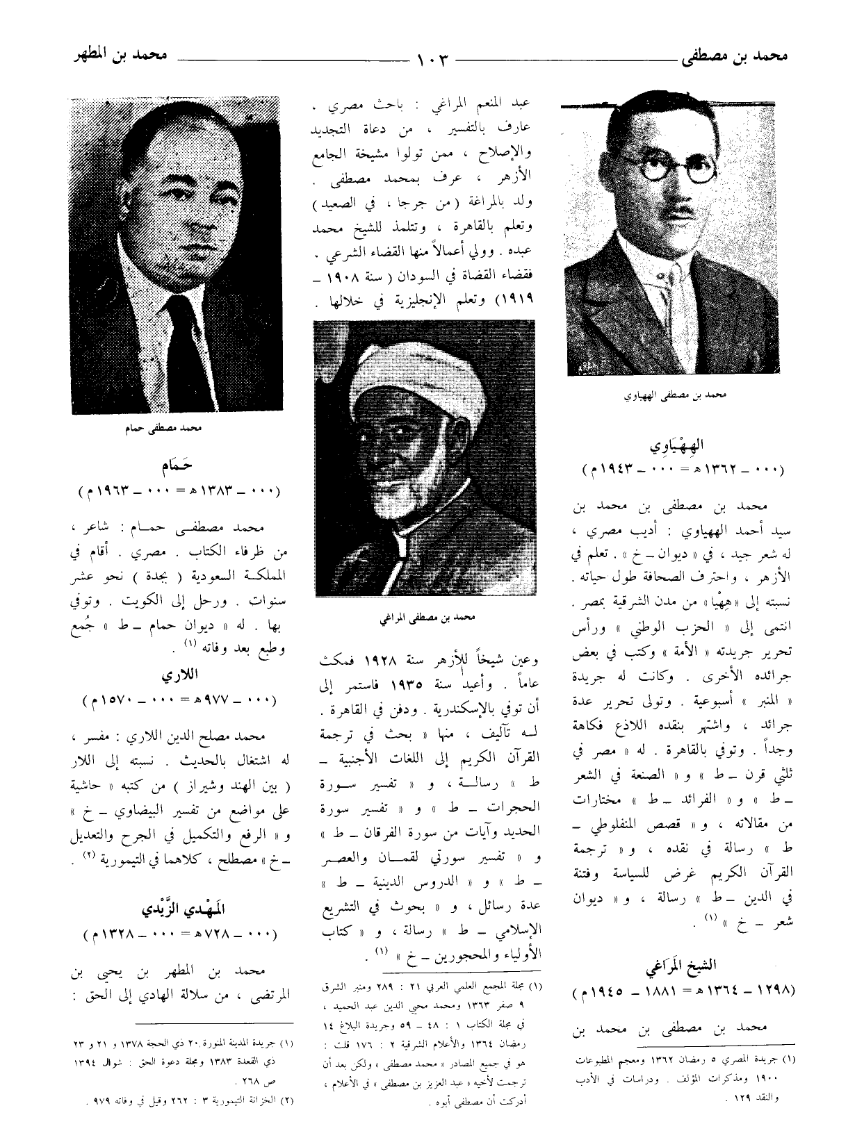 (1) مجلة المجمع العلمي العربيّ 21: 289 ومنبر الشرق 9 صفر 1363 ومحمد محيي الدين عبد الحميد، في مجلة الكتاب 1: 48 - 59 وجريدة البلاغ 14 رمضان 1364 والأعلام الشرقية 2: 176 قلت: هو في جميع المصادر (محمد مصطفى) ولكن بعد أن ترجمت لأخيه (عبد العزيز بن مصطفى) في الأعلام،. أدركت أن مصطفى أبوه.