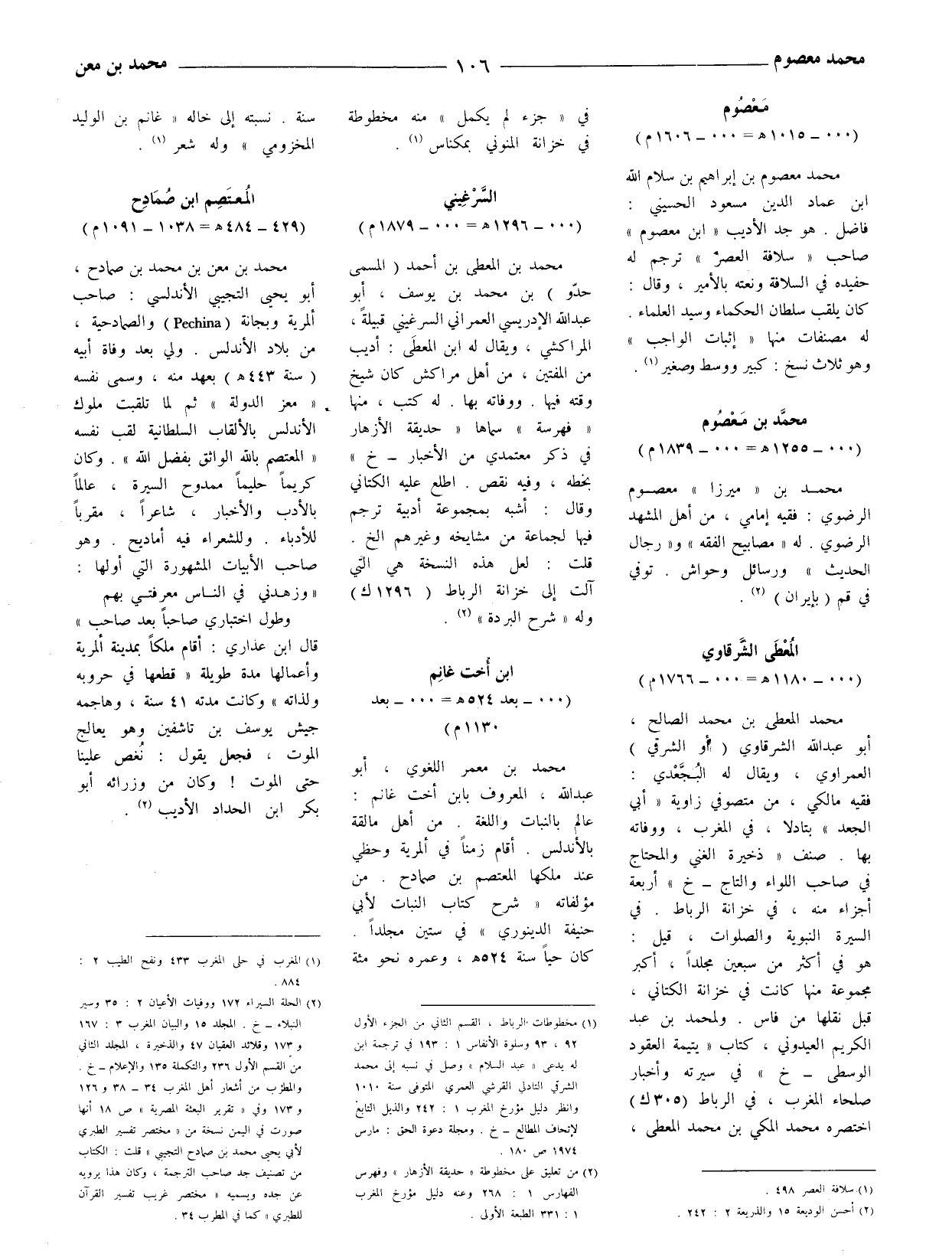 (1) مخطوطات الرباط، القسم الثاني من الجزء الأول 92، 93 وسلوة الأنفاس 1: 193 في ترجمة ابن له يدعى (عبد السلام) وصل في نسبه إلى محمد الشرقي التادلي القرشي العمري المتوفى سنة 1010 وانظر دليل مؤرخ المغرب 1: 242 والذيل التابع لإتحاف المطالع - خ.