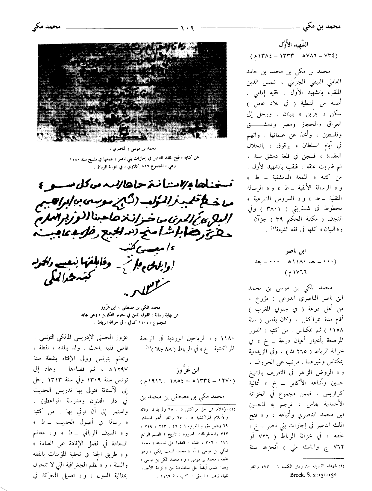 (1) الإعلام بمن حل مراكش 5: 65 ولم يذكر وفاته والأعلام المراكشية 5: 65 وانظر أهم المصادر 69 ودليل مؤرخ المغرب 1: 46، 213، 249، 343 والمخطوطات المصورة: تاريخ 2 القسم الرابع 171، 306، قلت: اتفقوا على تسميته (محمد المكى بن موسى) أو (محمد الملقب بمكى) وهو بخطه (محمد بن موسى) و (محمد المكى بن موسى) وهذا عندي أيضا على مخطوطة من (نزهة الابصار للبهاء زهير) اليمنى، كتب سنة 1166.