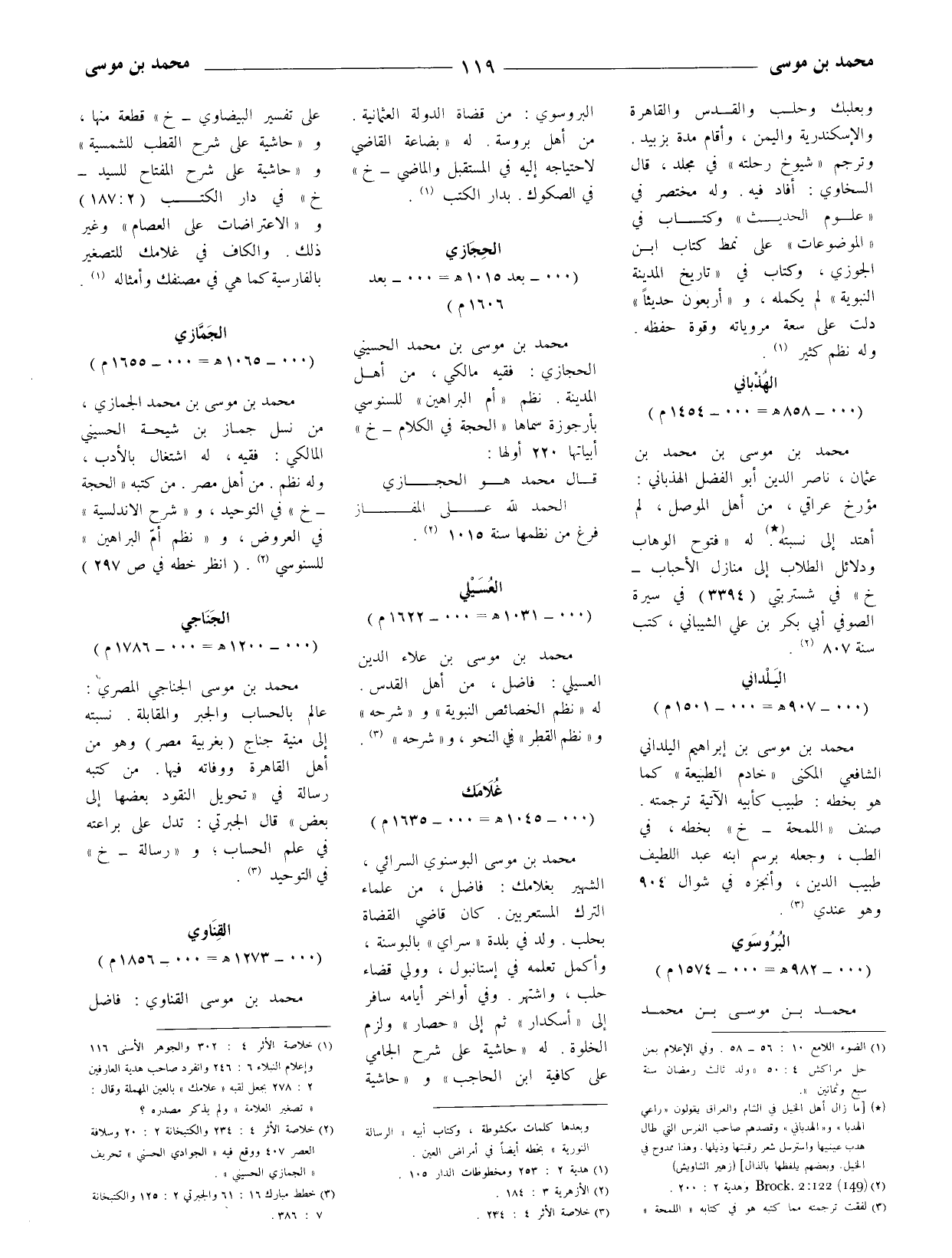 (1) خلاصة الأثر 4: 302 والجوهر الأسنى 116 وإعلام النبلاء 6: 246 وانفرد صاحب هدية العارفين 2: 278 بجعل لقبه (علامك) بالعين المهملة وقال: (تصغير العلامة) ولم يذكر مصدره (2) خلاصة الأثر 4: 234 والكتبخانة 2: 20 وسلافة العصر 407 ووقع فيه (الجوادي الحسني) تحريف (الجمازي الحسيني) .