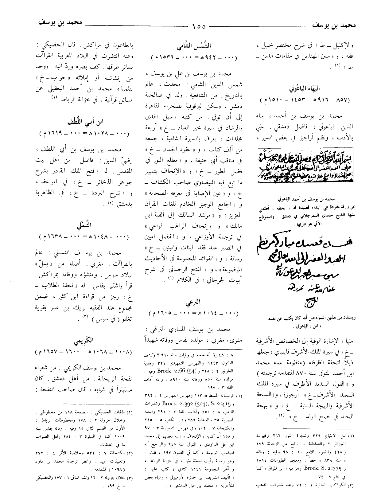 محمد بن يوسف بن أحمد، بهاء الدين الباعوني: فاضل دمشقي. عني بالأدب، ونظم أراجيز في بعض السير، منها (الإشارة الوفية إلى الخصائص الأشرفية - خ) في سيرة الملك الأشرف قايتباي، جعلها ذيلا لتحفة الظرفاء (منظومة عمه محمد ابن أحمد المتوفى سنة 870 المتقدمة ترجمته) و (القول السديد الأظرف في سيرة الملك السعيد الأشرف - خ) أرجوزة، و (اللمحة الأشرفية والبهجة السنية - خ) و (بهجة الخلد في نصح الولد - خ) (2) .