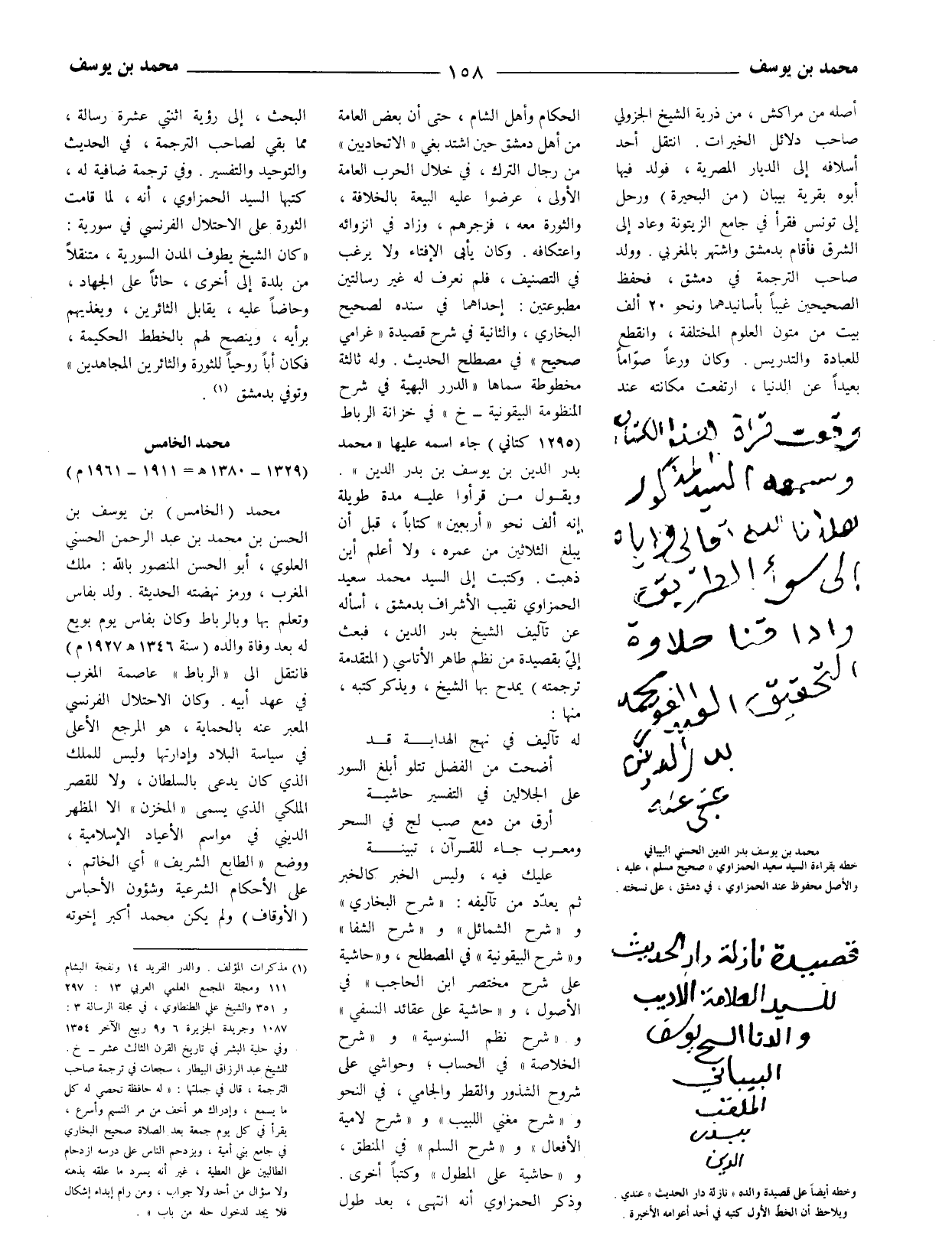 عند الحكام وأهل الشام، حتى أن بعض العامة من أهل دمشق حين اشتد بغي (الاتحاديين) من رجال الترك، في خلال الحرب العامة الأولى، عرضوا عليه البيعة بالخلافة، والثورة معه، فزجرهم، وزاد في انزوائه واعتكافه، وكان يأبى الإفتاء ولا يرغب في التصنيف، فلم نعرف له غير رسالتين مطبوعتين: إحداهما في سنده لصحيح البخاري والثانية في شرح قصيدة (غرامي صحيح) في مصطلح الحديث. وله ثالثة مخطوطة سماها (الدرر البهية في شرح المنظومة البيقونية - خ) في خزانة الرباط (1295 كتاني) جاء اسمه عليها (محمد بدر الدين بن يوسف بن بدر الدين) . ويقول من قرأوا عليه مدة طويلة إنه ألف نحو (أربعين) كتابا قبل أن يبلغ الثلاثين من عمره، ولا أعلم أين ذهبت. وكتبت إلى السيد محمد سعيد الحمزاوي، نقيب الأشراف بدمشق، أسأله عن تآليف الشيخ بدر الدين، فبعث إليّ بقصيدة من نظم طاهر الا تاسى (المتقدمة ترجمته) يمدح بها الشيخ، ويذكر كتبه، منها: