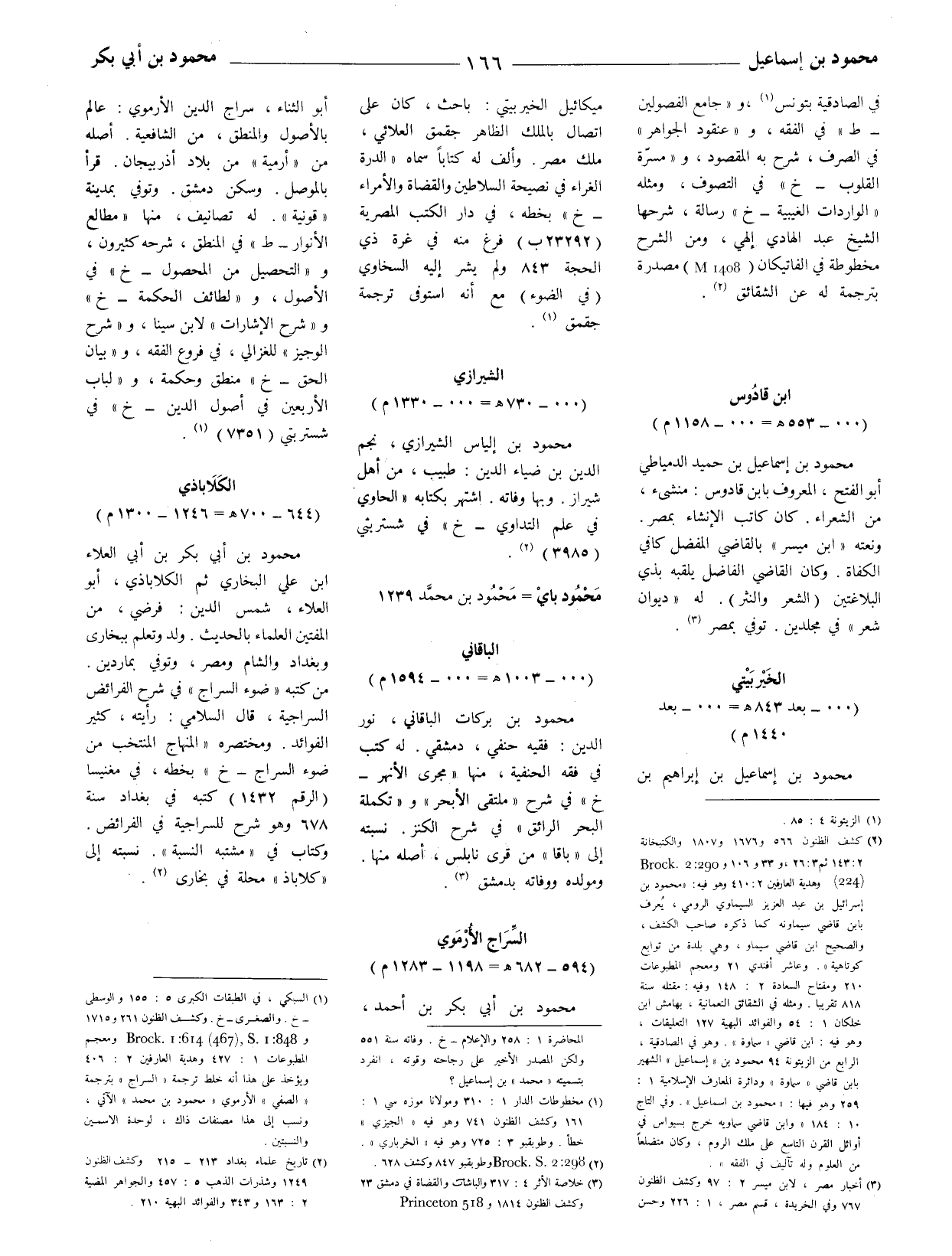 (1) السبكي، في الطبقات الكبرى 5: 155 والوسطى - خ. والصغرى - خ. وكشف الظنون 261 و 1715 و Brock 1: 614 (467) S 1: 848. ومعجم المطبوعات 1: 427 وهدية العارفين 2: 406 ويؤخذ على هذا أنه خلط ترجمة (السراج بترجمة) (الصَّفّي) الأُرْمَوي (محمود بن محمد) الآتي، ونسب إلى هذا مصنفات ذاك، لوحدة الاسمين والنسبتين.