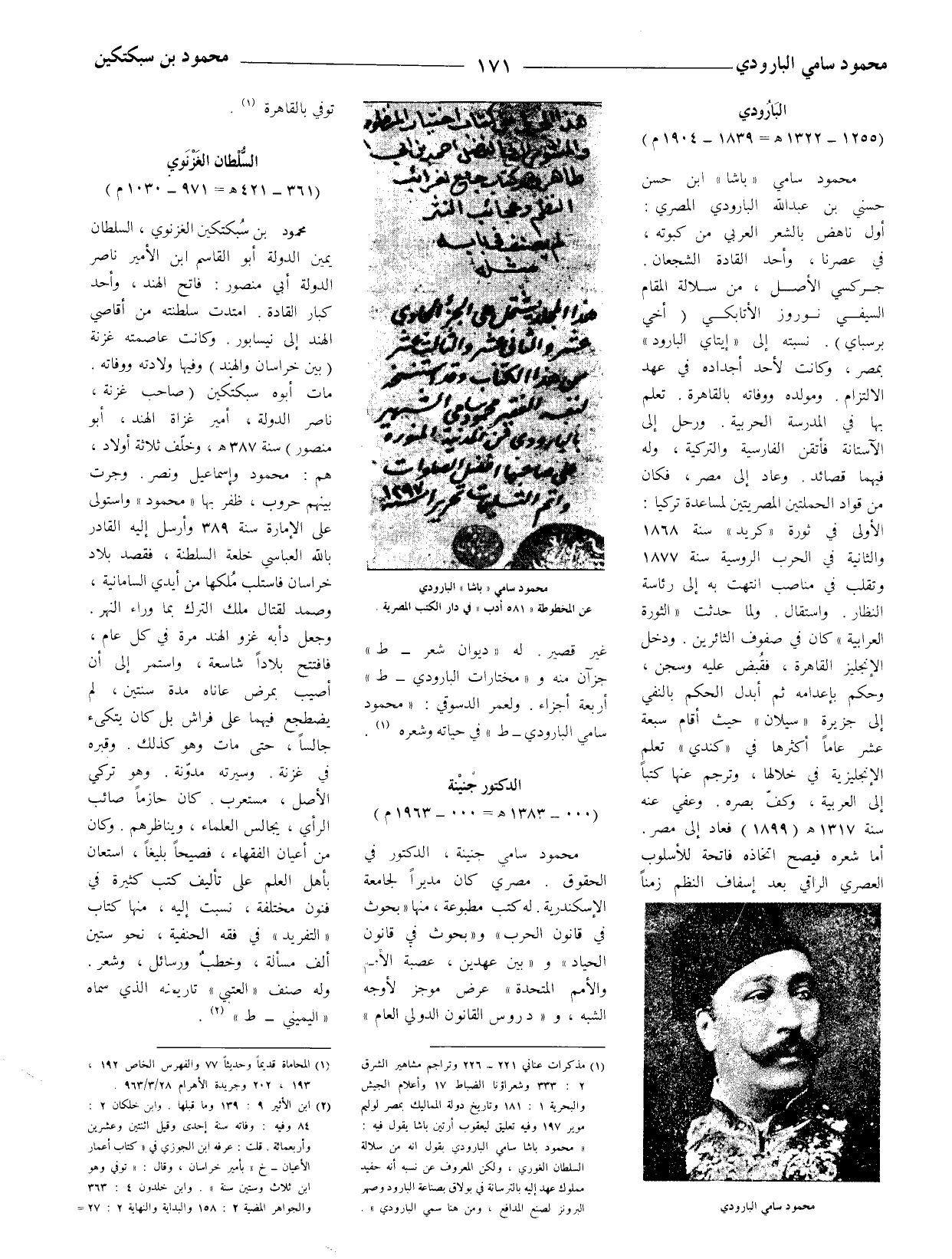 (1) مذكرات عناني 221 - 226 وتراجم مشاهير الشرق 2: 333 وشعراؤنا الضباط 17 وأعلام الجيش والبحرية 1: 181 وتاريخ دولة المماليك بمصر لوليم موير 197 وفى تعليق ليعقوب أرتين باشا يقول فيه: (محمود باشا سامي البارودى يقول أنه من سلالة السلطان الغوري، ولكن المعروف عن نسبه أنه حفيد مملوك عهد إليه بالترسانة في بولاق بصناعة البارود وصهر البرونز لصنع المدافع، ومن هنا سمي البارودي) .