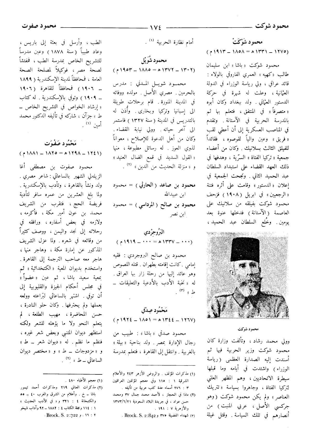 محمود شوكت (باشا) ابن سليمان طالب (كهيه) العمري الفاروقي بالولاء: قائد عراقي ولي رياسة الوزراء في الدولة العثمانية، وعلت له شهرة في حركة الدستور العثماني. ولد ببغداد وكان أبوه (متصرفا) في المنتفق، فتعلم بها ثم بالمدرسة الحربية في الأستانة. وتقدم في المناصب العسكرية إلى أن أعطي لقب (فريق) وعين واليا لقوصوه، فقائدا للفيلق الثالث بسلانيك. وكان من أعضاء جمعية (تركيا الفتاة) السّرية، وهدفها في ذلك العهد القضاء على استبداد السلطان عبد الحميد الثاني. ونجحت الجمعية في إعلان (الدستور) وقامت على أثره فتنة (الرجعيين) في آبريل (1908) فزحف محمود شوكت بفيلقه من سلانيك على العاصمة (الآستانة) فدخلها عنوة بعد يومين. وخلع السلطان عبد الحميد، وولي محمد رشاد، وتألفت وزارة كان محمود شوكت وزير الحربية فيها ثم أسندت إليه الصدارة العظمى (رياسة الوزراء) واشتدت في أيامه وما قبلها سيطرة الاتحاديين، وهم المظهر العلني لتركيا الفتاة، وجاهروا بسياسة (تتريك العناصر) ولم يكن محمود شوكت (وهو جركسي الأصل، عربي المنبت) من أنصارهم في تلك السياسة. وقتل غيلة