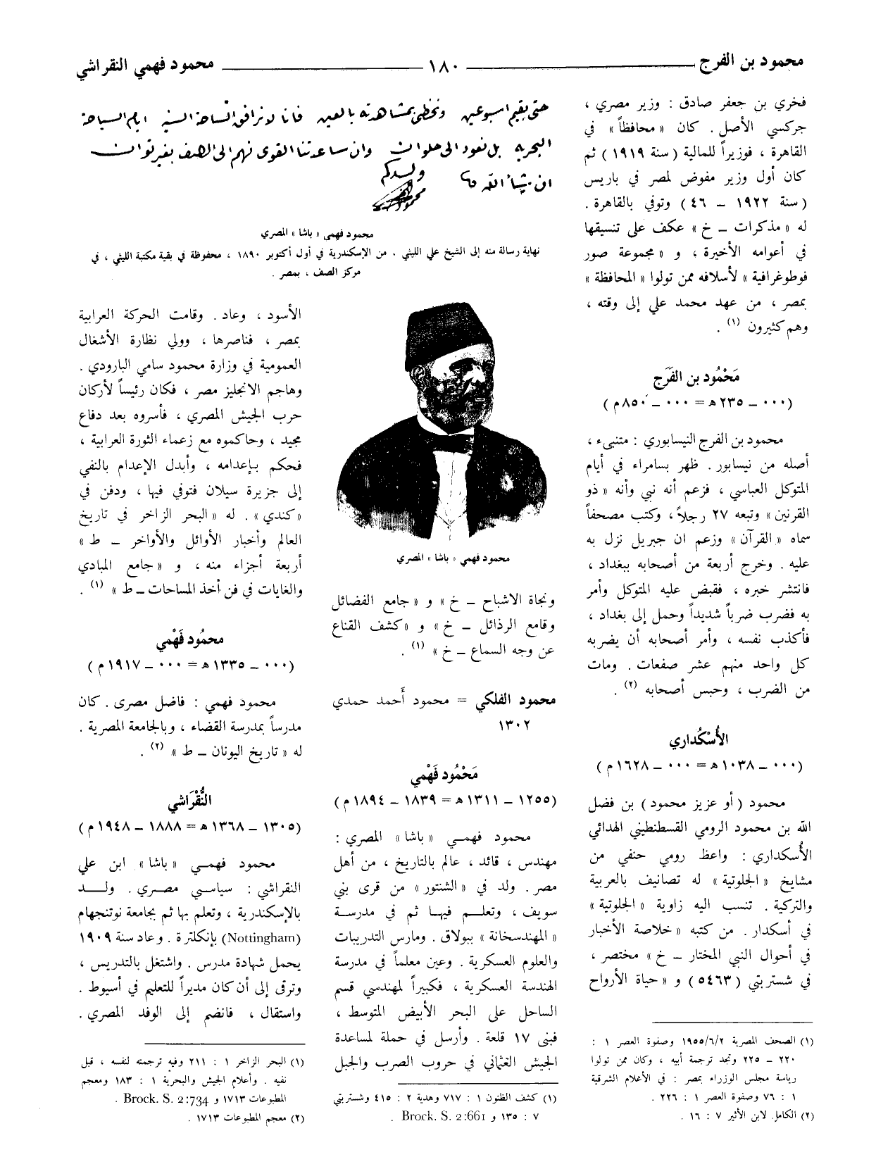 محمود فهمي (باشا) المصري: مهندس، قائد، عالم بالتأريخ، من أهل مصر. ولد في (الشنتور) من قرى بني سويف، وتعلم فيها ثم في مدرسة (المهندسخانة) ببولاق. ومارس التدريبات والعلوم العسكرية. وعين معلما في مدرسة الهندسة العسكرية، فكبيرا لمهندسي قسم الساحل على البحر الأبيض المتوسط، فبنى 17 قلعة. وأرسل في حملة لمساعدة الجيش العثماني في حروب الصرب والجبل