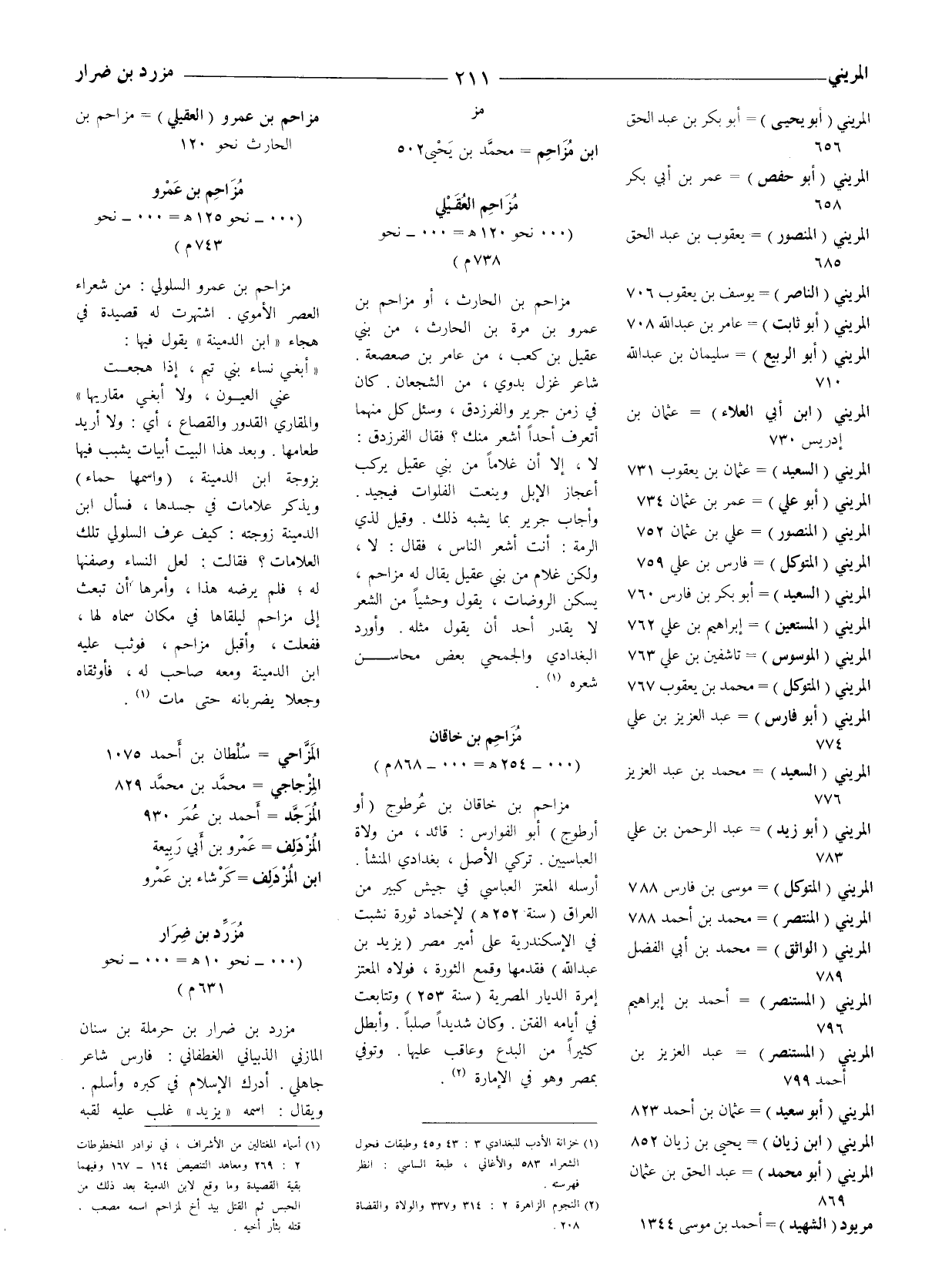 (1) أسماء المغتالين من الأشراف، في نوادر المخطوطات 2: 269 ومعاهد التنصيص 164 - 167 وفيهما بقية القصيدة وما وقع لابن الدمينة بعد ذلك من الحبس ثم القتل بيد أخ لمزاحم اسمه مصعب، قتله بثأر أخيه.