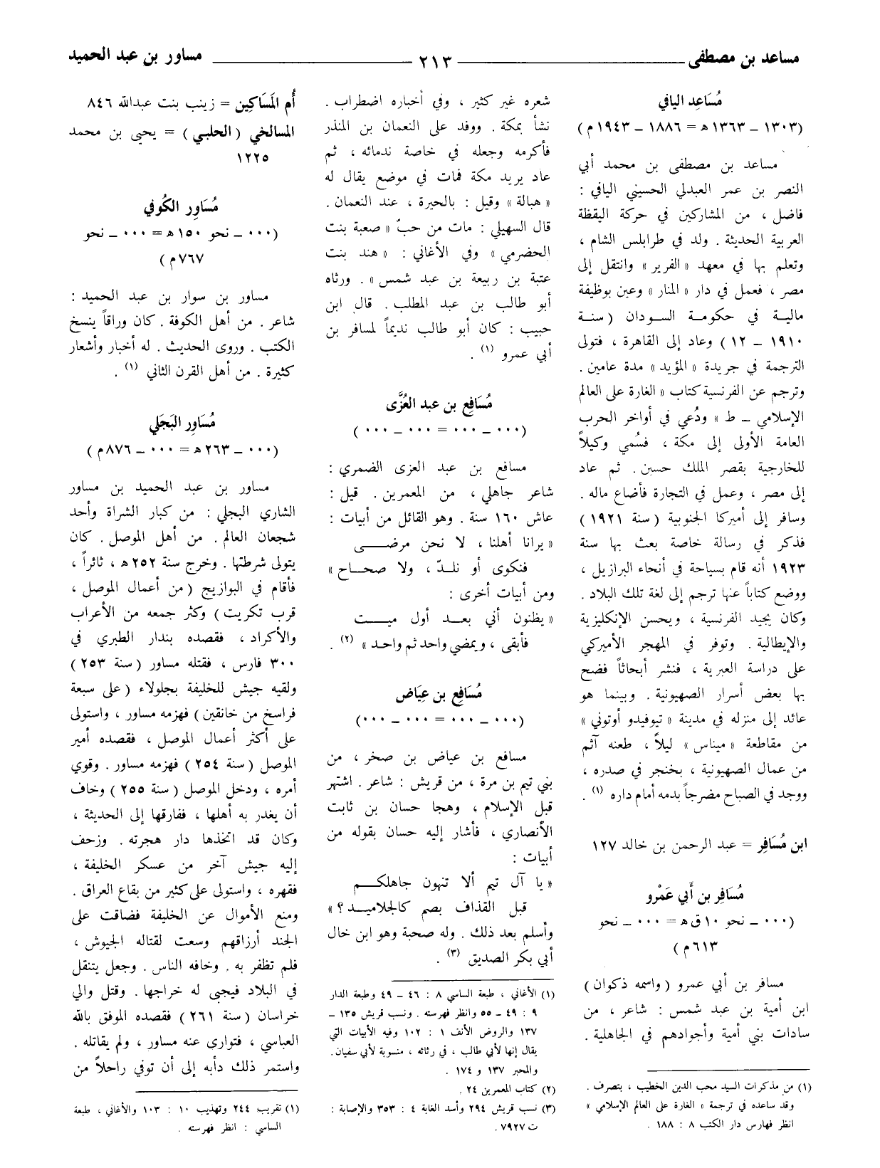 مساعد بن مصطفى بن محمد أبي النصر بن عمر العبدلي الحسيني اليافي: فاضل، من المشاركين في حركة اليقظة العربية الحديثة. ولد في طرابلس الشام، وتعلم بها في معهد (الفرير) وانتقل إلى مصر، فعمل في دار (المنار) وعين بوظيفة مالية في حكومة السودان (سنة 1910 - 12) وعاد إلى القاهرة، فتولى الترجمة في جريدة (المؤيد) مدة عامين. وترجم عن الفرنسية كتاب (الغارة على العالم الإسلامي - ط) ودُعي في أواخر الحرب العامة الأولى إلى مكة، فسُمي وكيلا للخارجية بقصر الملك حسين. ثم عاد إلى مصر وعمل في التجارة فأضاع ماله. وسافر إلى أميركا الجنوبية (سنة 1921) فذكر في رسالة خاصة بعث بها سنة 1923 أنه قام بسياحة في أنحاء البرازيل، ووضع كتابا عنها ترجم إلى لغة تلك البلاد. وكان يجيد الفرنسية، ويحسن الإنكليزية والإيطالية، وتوفر في المهجر الأميركي على دراسة العبرية، فنشر أبحاثا فضح بها بعض أسرار الصهيونية. وبينما هو عائد إلى منزله في مدينة (تيوفيدو أوتوني) من مقاطعة (ميناس) ليلا، طعنه آثم من عمال الصهيونية، بخنجر في صدره، ووجد في الصباح مضرجا بدمه أمام داره (1) .