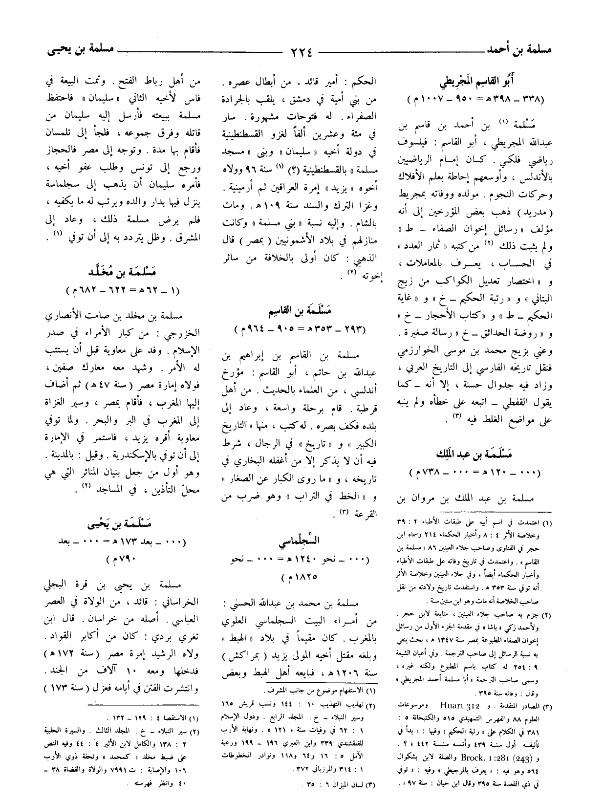 (3) المصادر المتقدمة. و 312 Huart وموسوعات العلوم 88 والفهرس التمهيدي 515 والكتبخانة 5: 381 في الكلام على (رتبة الحكيم) وفيها: (بدأ في تأليفه أول سنة 439 وأتمه سنة 442) ؟. و (243) 281: 1.Brock والصلة لابن بشكوال 564 وهو فيه: (يعرف بالمرجيطى) وفيه: (توفى في ذى القعدة سنة 395 وقال ابن حيان: سنة 97) .