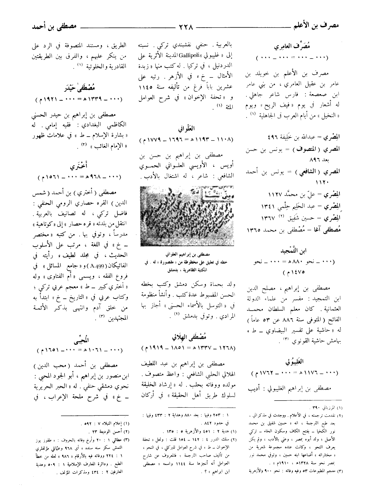 مصطفى بن إبراهيم بن حسن بن أويس، الأويسي العلواني الحموي الشافعيّ: شاعر، له اشتغال بالأدب. ولد بحماة وسكن دمشق وكتب بخطه الحسن المضبوط عدة كتب. وأنشأ منظومة في (التوسل بالأسماء الحسنى) أجاز بها المرادي. وتوفي بدمشق (2) .