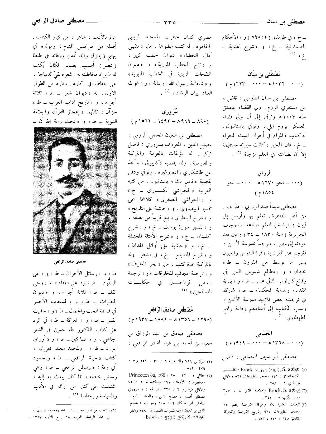 عالم بالأدب، شاعر، من كبار الكتاب. أصله من طرابلس الشام، ومولده في بهتيم (بمنزل والد أمه) ووفاته في طنطا (بمصر) أصيب بصمم فكان يكتب له ما يراد مخاطبته به. شعره نقيّ الديباجة، على جفاف في أكثره. ونثره من الطراز الأول. له (ديوان شعر - ط) ثلاثة أجزاء، و (تاريخ آداب العرب - ط) جزآن، ثالثهما (إعجاز القرآن والبلاغة النبويّة - ط) و (تحت راية القرآن - ط) و (رسائل الأحزان - ط) و (على السفّود - ط) رد على العقاد، و (وحي القلم - ط) ثلاثة أجزاء، و (ديوان النظرات - ط) و (السحاب الأحمر في فلسفة الحب والجمال - ط) و (حديث القمر - ط) و (المعركة - ط) في الرد على كتاب الدكتور طه حسين في الشعر الجاهلي، و (المساكين - ط) و (أوراق الورد - ط) . ولمحمد سعيد العريان، كتاب (حياة الرافعي - ط) ولمحمود أبي رية: (رسائل الرافعي - ط) وهي رسائل خاصة، مما كان يبعث به إليه، اشتملت على كثير من آرائه في الأدب والسياسة ورجالهما (1) .