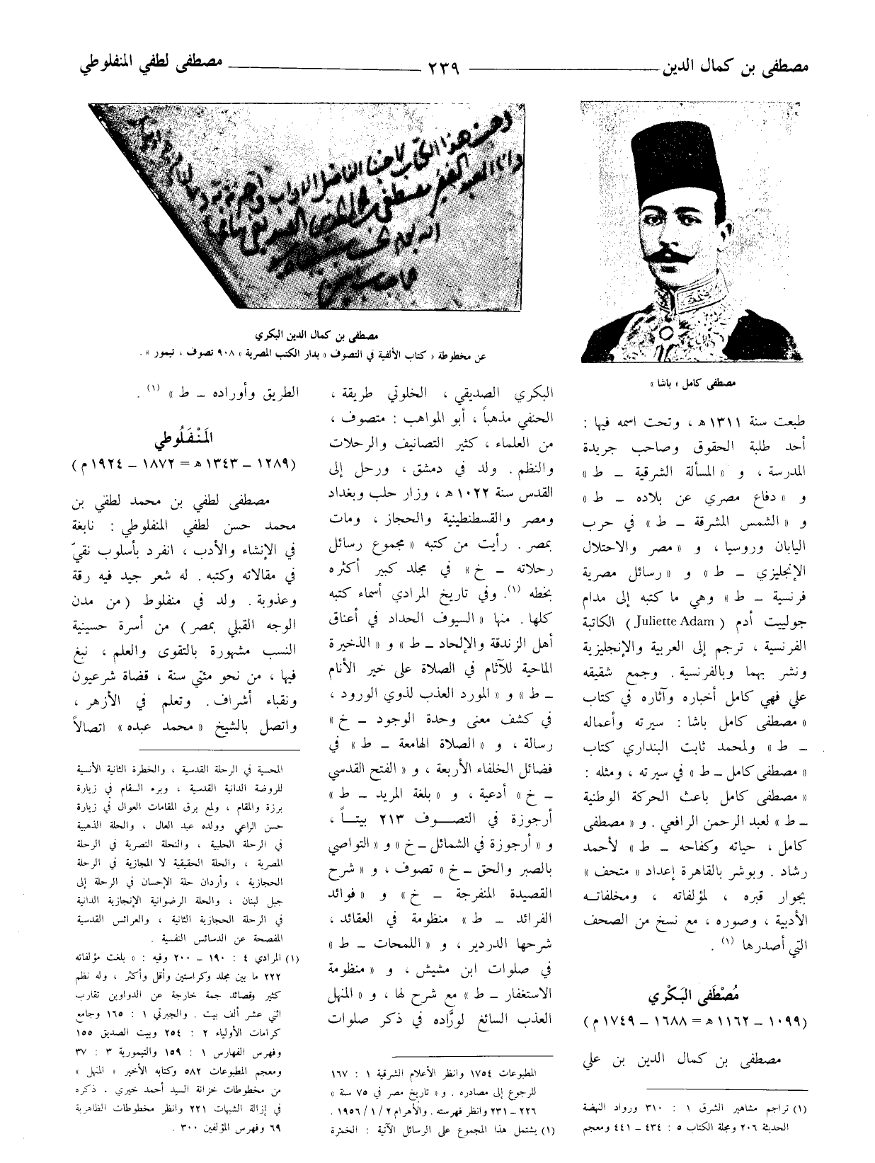 مصطفى لطفي بن محمد لطفي بن محمد حسن لطفي المنفلوطي: نابغة في الإنشاء والأدب، انفرد بأسلوب نقيّ في مقالاته وكتبه. له شعر جيد فيه رقة وعذوبة. ولد في منفلوط (من مدن الوجه القبلي بمصر) من أسرة حسينية النسب مشهورة بالتقوى والعلم، نبغ فيها، من نحو مئتي سنة، قضاة شرعيون ونقباء أشراف. وتعلم في الأزهر، واتصل بالشيخ (محمد عبده) اتصالا