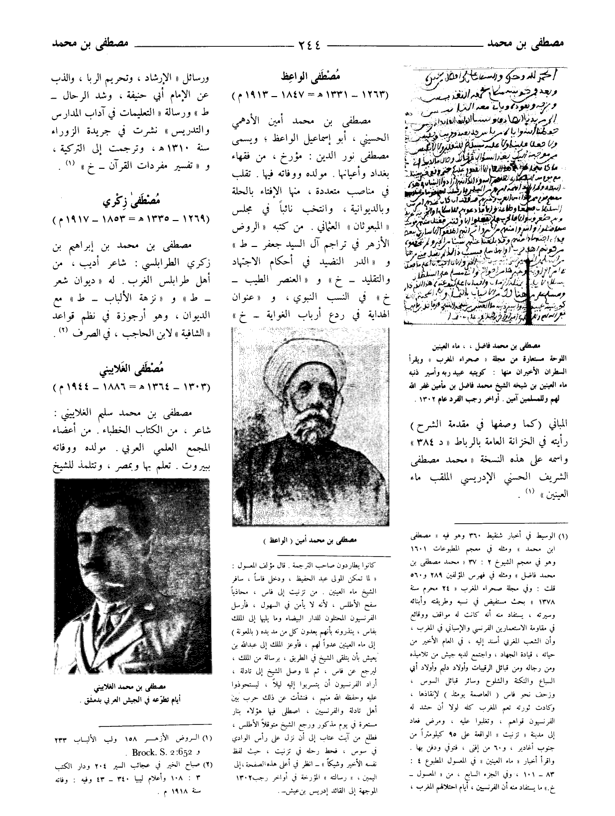(1) الوسيط في أخبار شنقيط 360 وهو فيه (مصطفى ابن محمد) ومثله في معجم المطبوعات 1601 وهو في معجم الشيوخ 2: 37 (محمد مصطفى بن محمد فاضل) ومثله في فهرس المؤلفين 289 و 560 قلت: وفى مجلة صحراء المغرب (24 محرم سنة 1378) بحث مستفيض في نسبه وطريقته وأبنائه وسيرته، يستفاد منه أنه كانت له مواقف ووقائع في مقاومة الاستعمارين الفرنسى والاسبانى في المغرب، وأن الشعب المغربي أسند إليه، في العام الاخير من حياته، قيادة الجهاد، واجتمع لديه جيش من تلاميذه ومن رجاله ومن قبائل الرقيبات وأولاد دليم وأولاد أبى السباع والنكتة والشلوح وسائر قبائل السوس، وزحف نحو فاس (العاصمة يومئذ) لانقاذها، وكادت ثورته تعم المغرب كله لولا أن حشد له الفرنسيون قواهم، وتغلبوا عليه، ومرض فعاد إلى مدينة (تزنيت) الواقعة على 95 كيلومترا من جنوب أغادير، و 60 من إفنى، فتوفي ودفن بها.