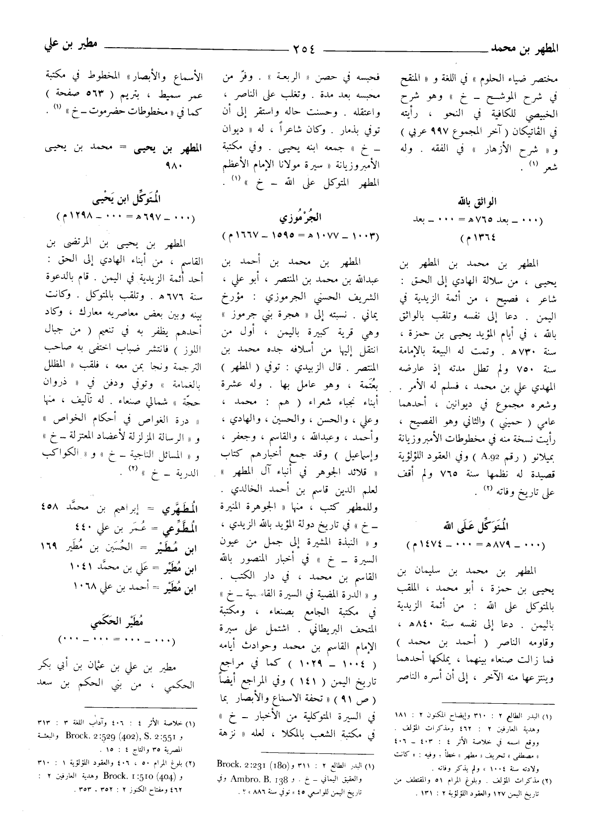 (1) البدر الطالع 2: 310 وإيضاح المكنون 2: 181 وهدية العارفين 2: 462 ومذكرات المؤلف. ووقع اسمه في خلاصة الأثر 4: 403 - 406 (مصطفى) تحريف (مطهر) خطأ، وفيه: (كانت ولادته سنة 1004) ولم يذكر وفاته.