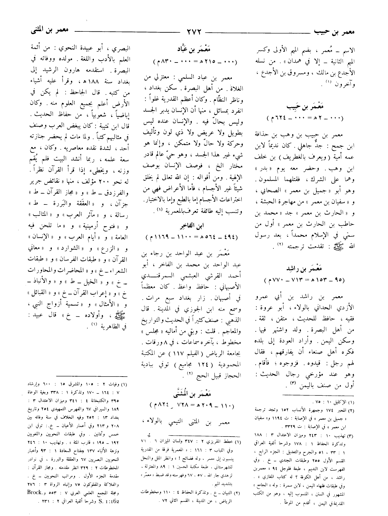 (1) خطط المقريزي 2: 347 ولسان الميزان 6: 71 وفي اللباب 3: 161: (المعمرية فرقة من القدرية ينسبون إلى معمر، وله فضائح!) وانظر الملل والنحل للشهرستاني، طبعة مكتبة الحسين 1: 89 والمعتزلة، لزهدي جار الله، 57، 67 وفهرسته وقد ضبط (معمّر) بتشديد الميم.