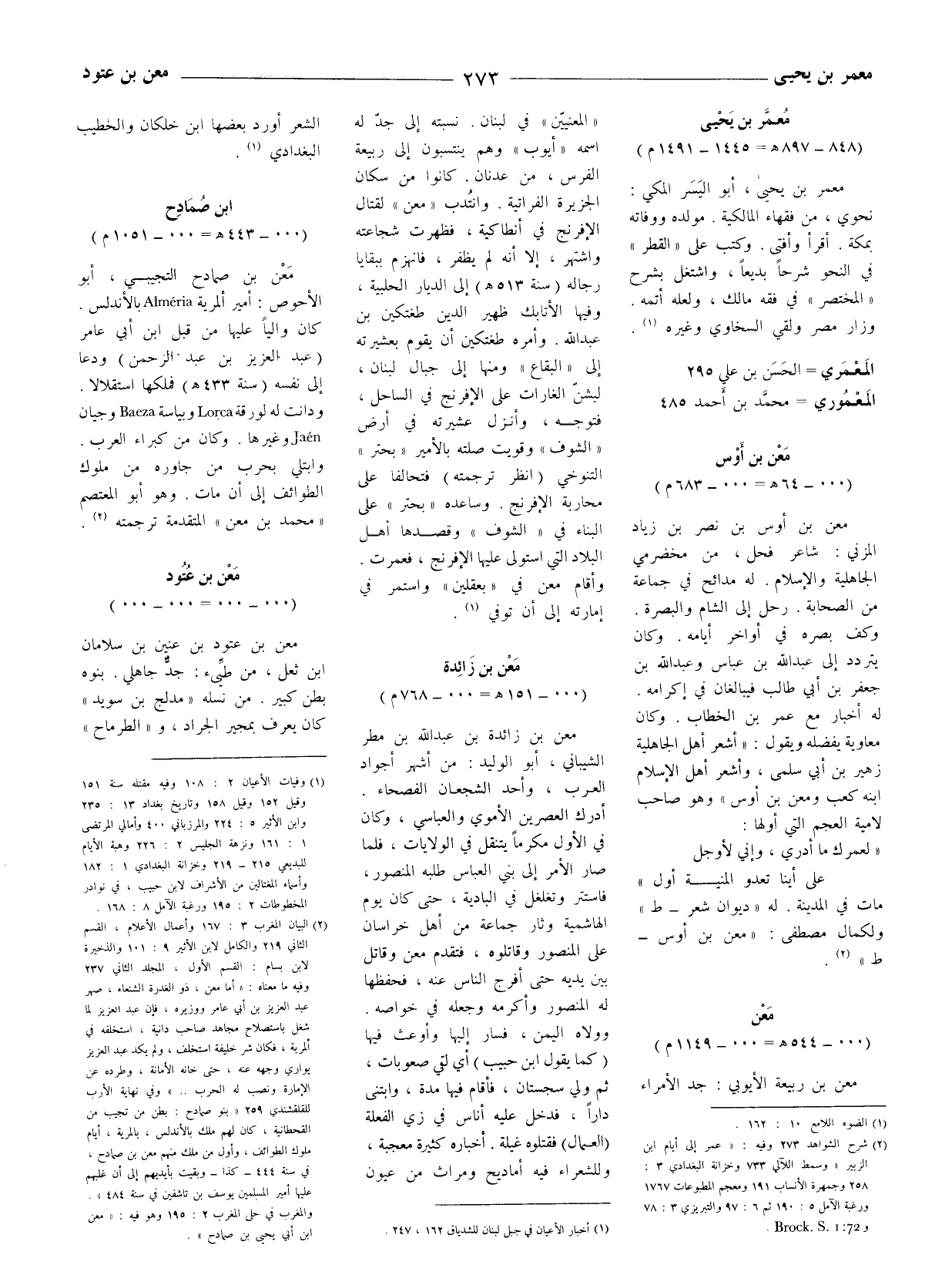(2) البيان المغرب 3: 167 وأعمال الأعلام، القسم الثاني 219 والكامل لابن الأثير 9: 101 والذخيرة لابن بسام: القسم الأول، المجلد الثاني 237 وفيه ما معناه: (أما معن، ذو الغدرة الشنعاء، صهر عبد العزيز بن أبي عامر ووزيره، فإن عبد العزيز لما شغل باستصلاح مجاهد صاحب دانية، استخلفه في المريّة، فكان شر خليفة استخلف، ولم يكد عبد العزيز يواري وجهه عنه، حتى خانه الامانة، وطرده عن الامارة ونصب له الحرب.) وفى نهاية الارب للقلقشندي 259 (بنو صمادح: بطن من تجيب من القحطانية، كان لهم ملك بالاندلس، بالمرية، أيام ملوك الطوائف، وأول من ملك منهم معن بن صمادح، في سنة 444 - كذا - وبقيت بأيديهم إلى أن غلبهم عليها أمير المسلمين يوسف بن تاشفين في سنة 484) . والمغرب في حلى المغرب 2: 195 وهو فيه: (معن ابن أبى يحيى بن صمادح) .
