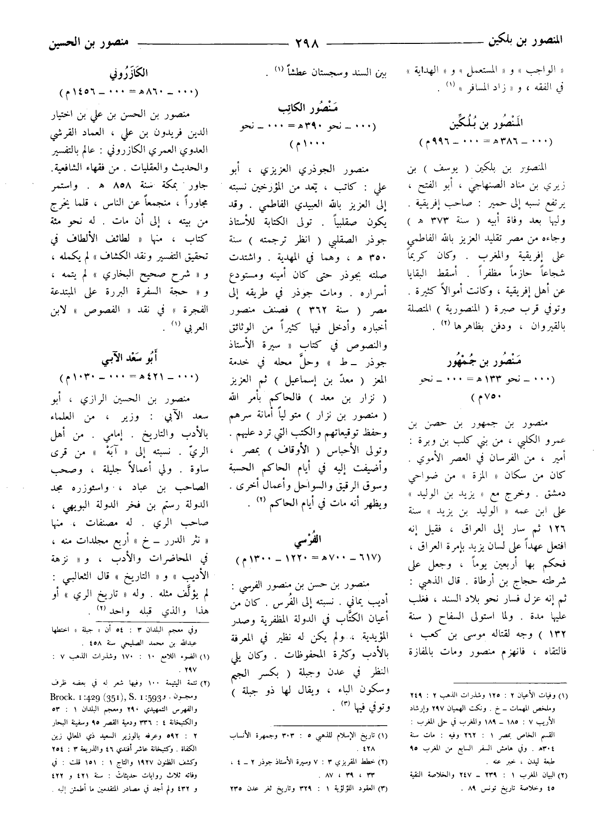 المنصور بن بلكين (يوسف) بن زيري بن مناد الصنهاجي، أبو الفتح، يرتفع نسبه إلى حمير: صاحب إفريقية. وليها بعد وفاة أبيه (سنة 373 هـ وجاءه من مصر تقليد العزيز باللَّه الفاطمي على إفريقية والمغرب. وكان كريما شجاعا حازما مظفرا. أسقط البقايا عن أهل إفريقية، وكانت أموالا كثيرة. وتوفي قرب صبرة (المنصورية) المتصلة بالقيروان، ودفن بظاهرها (2) .