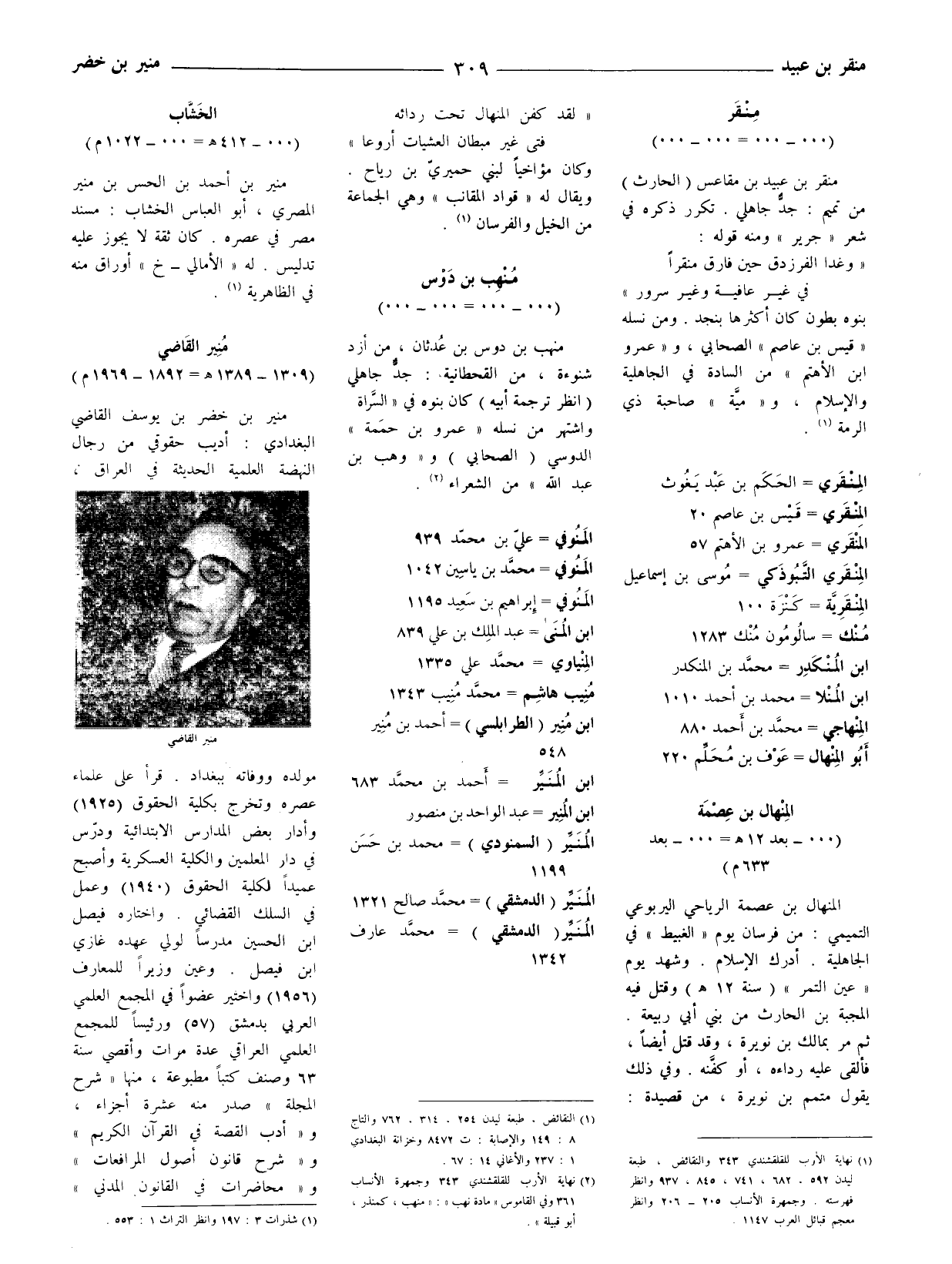 منير بن خضر بن يوسف القاضي البغدادي: أديب حقوقي من رجال النهضة العلمية الحديثة في العراق، مولده ووفاته ببغداد. قرأ على علماء عصره وتخرج بكلية الحقوق (1925) وأدار بعض المدارس الابتدائية ودرّس في دار المعلمين والكلية العسكرية وأصبح عميدا لكلية الحقوق (1940) وعمل في السلك القضائي. واختاره فيصل ابن الحسين مدرسا لولي عهده غازي ابن فيصل. وعين وزيرا للمعارف (1956) واختير عضوا في المجمع العلمي العربيّ بدمشق (57) ورئيسا للمجمع العلمي العراقي عدة مرات وأقصي سنة 63 وصنف كتبا مطبوعة، منها (شرح المجلة) صدر منه عشرة أجزاء، و (أدب القصة في القرآن الكريم) و (شرح قانون أصول المرافعات) و (محاضرات في القانون المدنى)
