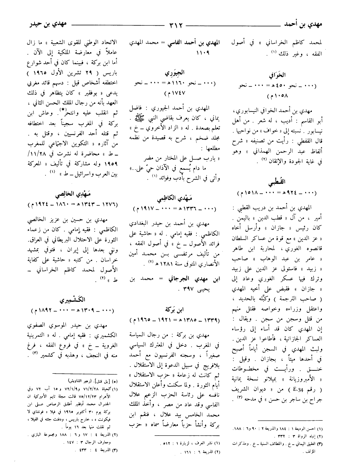 مهدي بن بركة: من رجال السياسة في المغرب. دخل في المعترك السياسي صغيرا وسجنه الفرنسيون مع أحمد بلا فريج في سبيل الدعوة إلى الاستقلال. ثم كانت له زعامة (حزب الاستقلال) أيام الثورة. ولما سكنت وأعلن الاستقلال نافسه على رئاسة الحزب الزعيم علال الفاسي وقد عاد من مصر، وأخذ الملك محمد الخامس بيد علال، فنقم ابن بركة وأنشأ حزبا معارضا سماه (حزب
