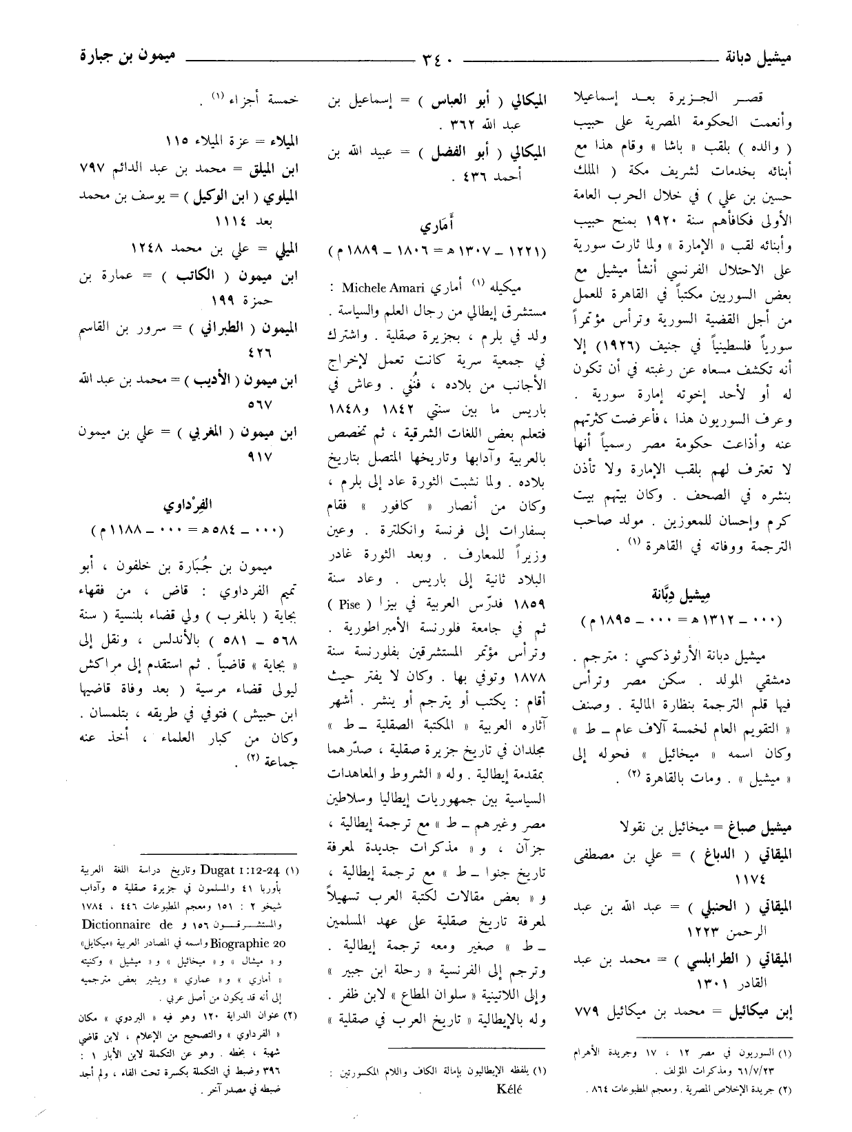 (1) 24 - 12: 1 Dugat وتاريخ دراسة اللغة العربية بأوربا 41 والمسلمون في جزيرة صقلّيّة 5 وآداب شيخو 2: 151 ومعجم المطبوعات 446، 1784 والمستشرقون 156 و Dictionnaire de Biographie 20 واسمه في المصادر العربية (ميكايل) و (ميشال) و (ميخائيل) و (ميشيل) وكنيته (أماري) و (عماري) ويشير بعض مترجميه إلى أنه قد يكون من أصل عربي.