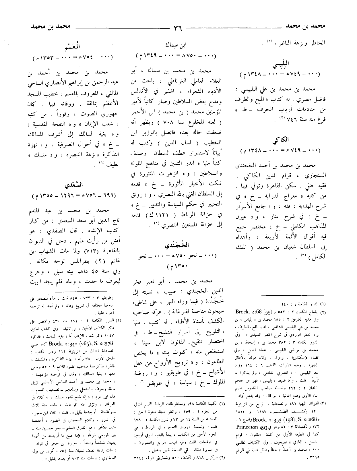 (2) إيضاح المكنون 2: 552 و Brock 2: 68 (55) وفي هدية العارفين 2: 155 محمد بن (إلياس) بن محمد بن علي البلبيسي الشافعيّ، له (الملح والطرف) و (العطر الوردي في شرح القطر الشهدي) . وفي الدرر الكامنة 3: 382 محمد بن (إسحاق) بن محمد بن مرتضى البلبيسي، عماد الدين، ولي قضاء الإسكندرية، وعزل، وكان مولعا بالألغاز الفقهية. وعنه شذرات الذهب 6: 164 وزاد بعد البلبيسي: (المصري الشافعيّ) ولم يذكرا له تأليفا. قلت: وأما ضبط (بلبيس) فهو عن معجم البلدان 2: 262 وضبطه صاحب القاموس بضم الباء الأولى وفتح الثانية، ثم قال: وقد يفتح أوله.