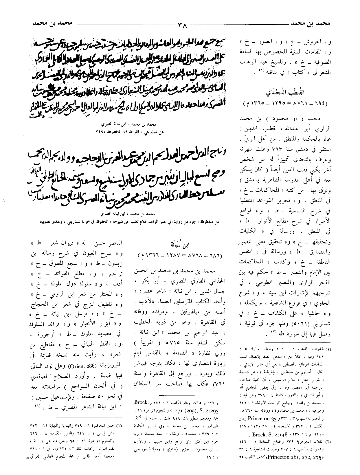 والنجوم الزاهرة 11: 87 ومعجم المطبوعات 918 قلت: اسمه في أكثر المصادر (محمد بن محمد) وفي الدرر الكامنة 4: 339 (محمود ويقال: اسمه محمد، وبه جزم ابن كثير وابن رافع وابن حبيب، وبالأول - أي محمود - جزم الإسنوي) ومولانا موزه سي 1: 19.