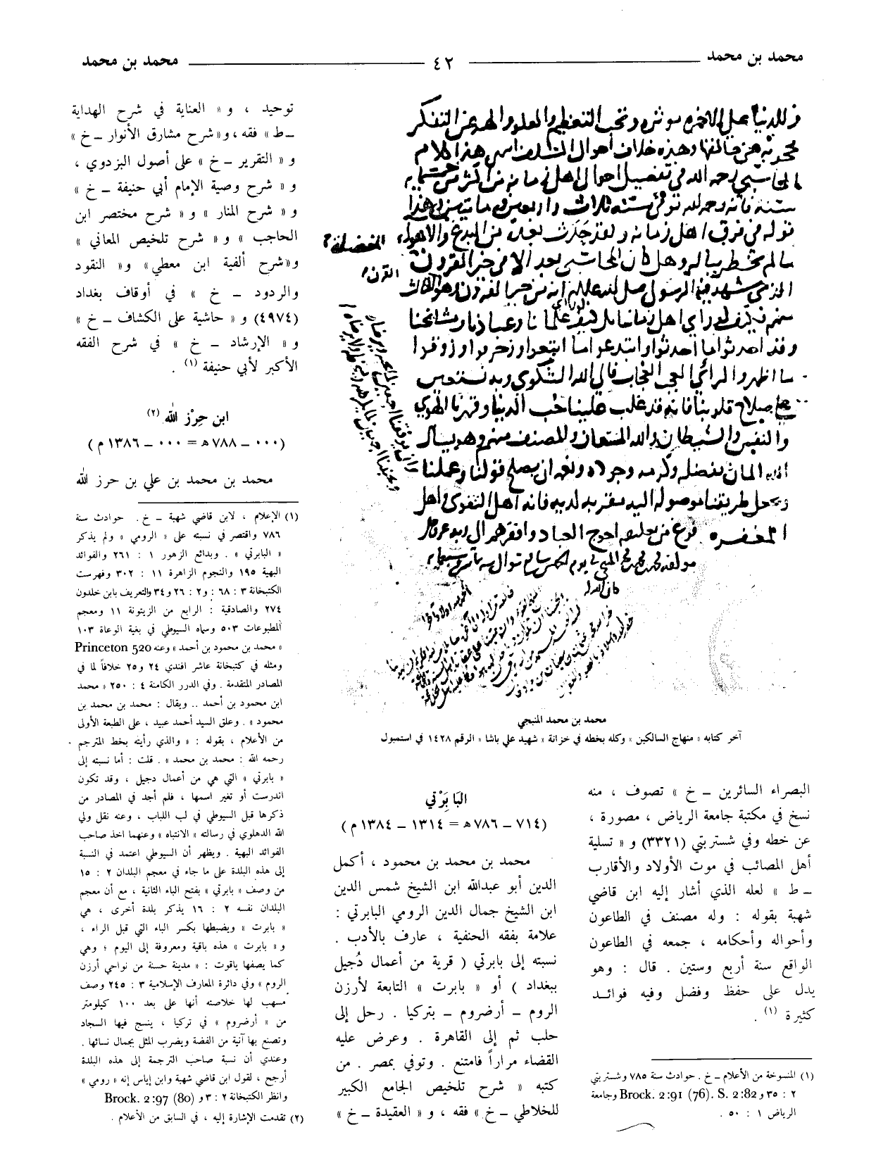 (1) الإعلام، لابن قاضي شهبة - خ. حوادث سنة 786 واقتصر في نسبته على (الرومي) ولم يذكر (البابرتي) . وبدائع الزهور 1: 261 والفوائد البهية 195 والنجوم الزاهرة 11: 302 وفهرست الكتبخانة 3: 68: و 2: 26 و 34 والتعريف بابن خلدون 274 والصادقية: الرابع من الزيتونة 11 ومعجم المطبوعات 503 وسماه السيوطي في بغية الوعاة 103 (محمد بن محمود بن أحمد) وعنه 520 Princeton ومثله في كتبخانة عاشر أفندي 24 و 25 خلافا لما في المصادر المتقدمة. وفي الدرر الكامنة 4: 250 (محمد ابن محمود بن أحمد. ويقال: محمد بن محمد بن محمود) . وعلق السيد أحمد عبيد، على الطبعة الاولى من الأعلام، بقوله: (والذي رأيته بخط المترجم رحمه الله: محمد بن محمد) قلت: أما نسبته إلى (بابرتي) التي هي من أعمال دجيل، وقد تكون اندرست أو تغير اسمها، فلم أجد في المصادر من ذكرها قبل السيوطي في لب اللباب، وعنه نقل ولي الله الدهلوي في رسالته (الانتباه) وعنهما اخذ صاحب الفوائد البهية. ويظهر أن السيوطي اعتمد في النسبة إلى هذه البلدة على ما جاء في معجم البلدان 2: 15 من وصف (بابرتي) بفتح الباء الثانية، مع أن معجم البلدان نفسه 2: 16 يذكر بلدة أخرى، هي (بابرت) ويضبطها بكسر الباء التي قبل الراء، و (بابرت) هذه باقية ومعروفة إلى اليوم، وهي كما يصفها ياقوت: (مدينة حسنة من نواحي أرزن الروم) وفي دائرة المعارف الاسلامية 3: 245 وصف مسهب لها خلاصته أنها على بعد 100 كيلومتر من (أرضروم) في تركيا، ينسج فيها السجاد وتصنع بها آنية من الفضة ويضرب المثل بجمال نسائها.