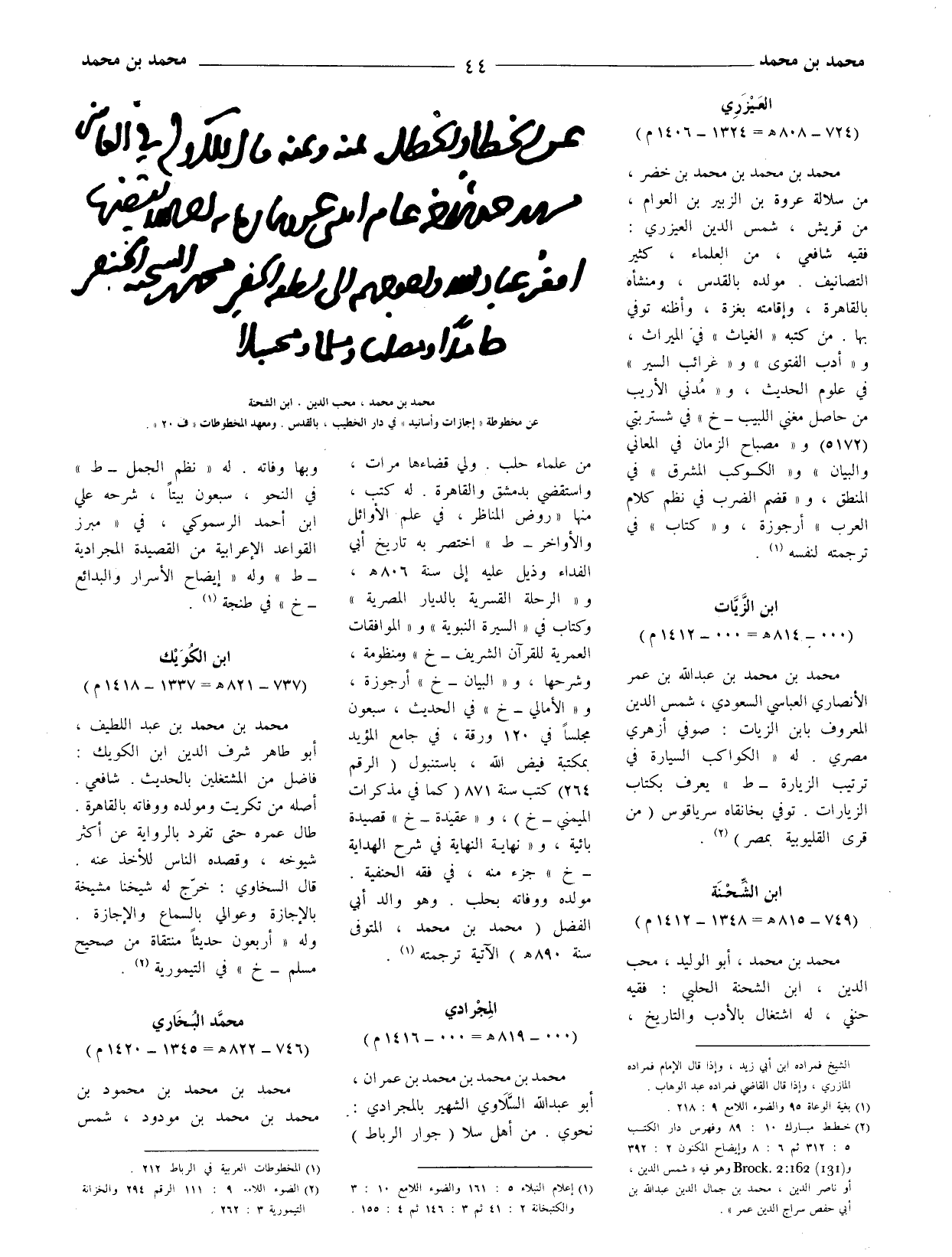 من علماء حلب. ولي قضاءها مرات، واستقضي بدمشق والقاهرة. له كتب، منها (روض المناظر، في علم الأوائل والأواخر - ط) اختصر به تاريخ أبي الفداء وذيل عليه إلى سنة 806 هـ و (الرحلة القسرية بالديار المصرية) وكتاب في (السيرة النبويّة) و (الموافقات العمرية للقرآن الشريف - خ) ومنظومة، وشرحها، و (البيان - خ) أرجوزة، و (الأمالي - خ) في الحديث، سبعون مجلسا في 120 ورقة، في جامع المؤيد بمكتبة فيض الله، باستنبول (الرقم 264) كتب سنة 871 (كما في مذكرات الميمني - خ) ، و (عقيدة - خ) قصيدة بائية، و (نهاية النهاية في شرح الهداية - خ) جزء منه، في فقه الحنفية. مولده ووفاته بحلب. وهو والد أبي الفضل (محمد بن محمد، المتوفى سنة 890 هـ الآتية ترجمته (1) .
