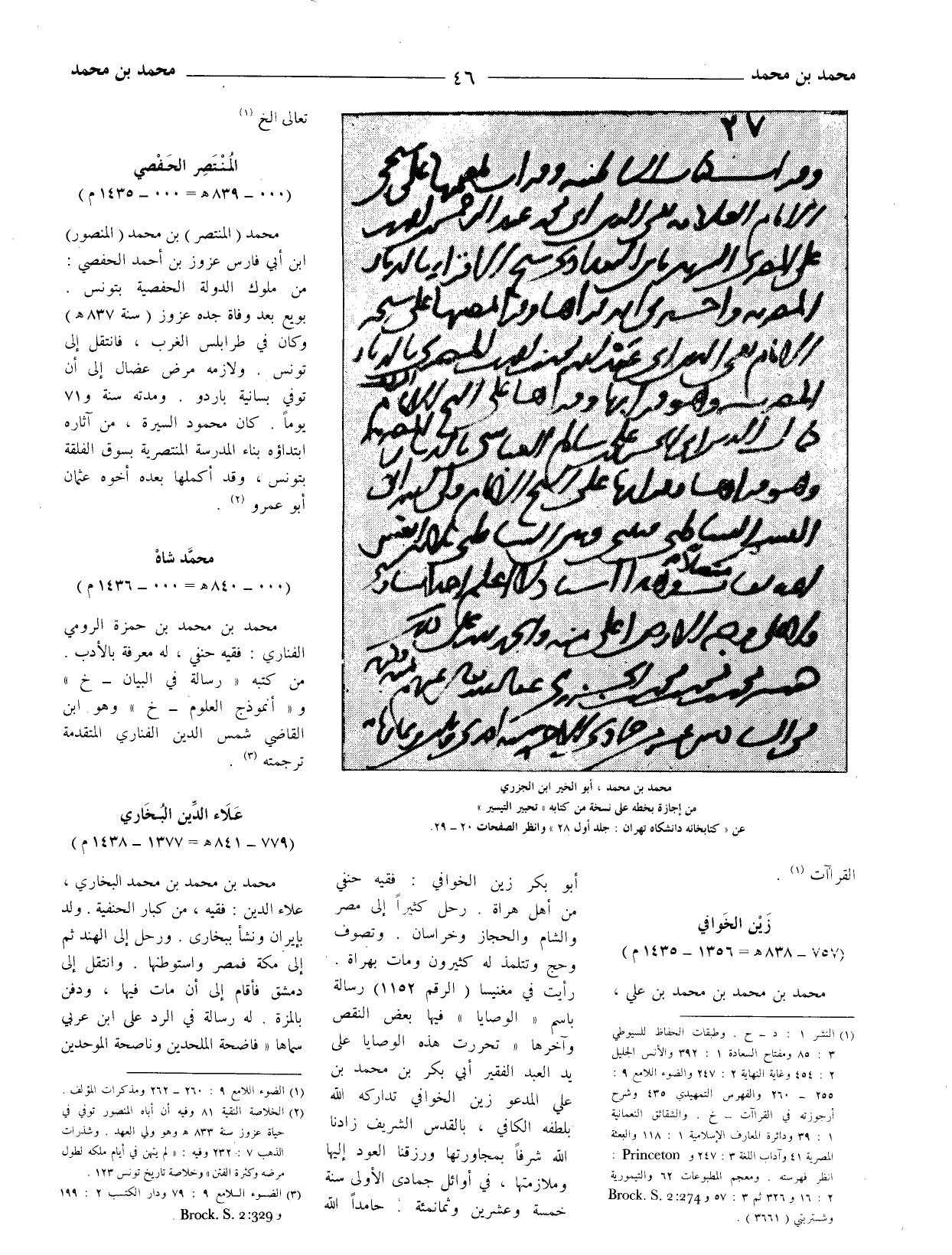 (1) النشر 1: د - ح وطبقات الحفاظ للسيوطي 3: 85 ومفتاح السعادة 1: 392 والأنس الجليل 2: 454 وغاية النهاية 2: 247 والضوء اللامع 9: 255 - 260 والفهرس التمهيدي 435 وشرح أرجوزته في القراآت - خ. والشقائق النعمانية 1: 39 ودائرة المعارف الاسلامية 1: 118 والبعثة المصرية 41 وآداب اللغة 3: 247 و: Princeton انظر فهرسته. ومعجم المطبوعات 62 والتيمورية 2: 16 و 326 ثم 3: 57 و Brock S 2: 274. وشستربتي (3661) .