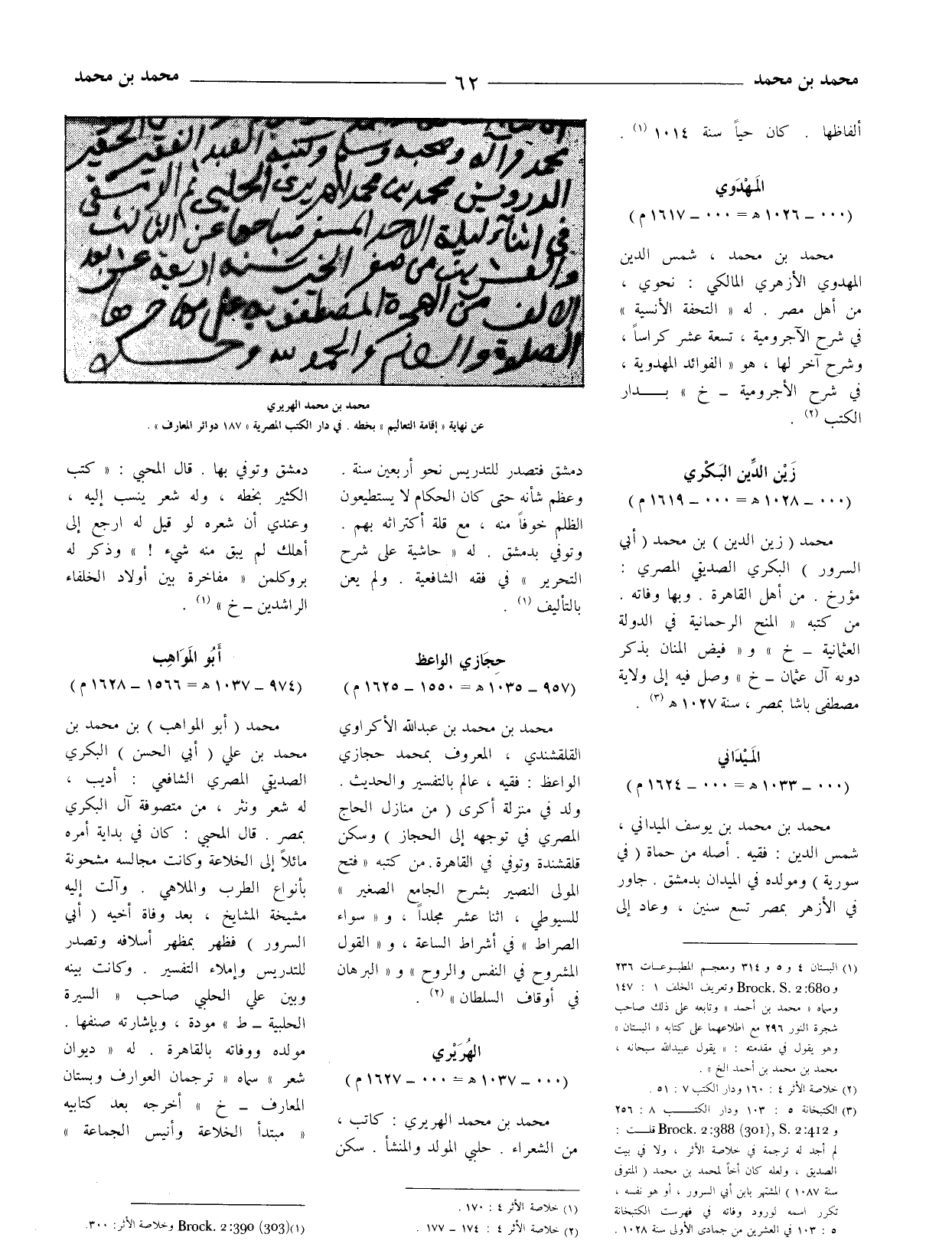 قلت: لم أجد ترجمة في خلاصة الأثر، ولا في بيت الصديق، ولعله كان أخا لمحمد بن محمد (المتوفى سنة 1087) المشتهر بابن أبي السرور، أو هو نفسه، تكرر اسمه لورود وفاته في فهرست الكتبخانة 5: 103 في العشرين من جمادى الأولى سنة 1028.
