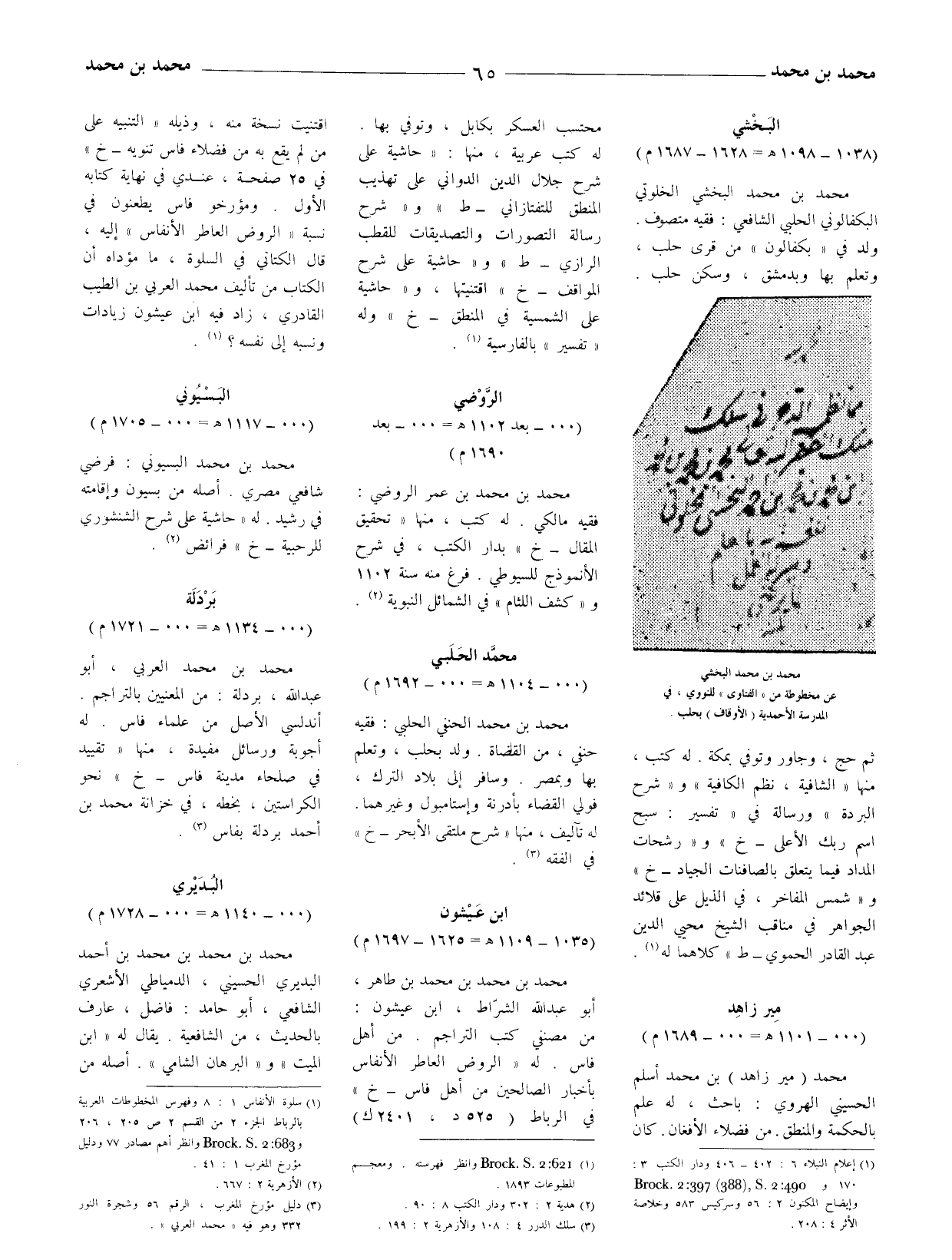 محمد بن محمد البخشي الخلوتي البكفالوني الحلبي الشافعيّ: فقيه متصوف. ولد في (بكفالون) من قرى حلب، وتعلم بها وبدمشق، وسكن حلب. ثم حج، وجاور وتوفي بمكة. له كتب، منها (الشافية، نظم الكافية) و (شرح البردة) ورسالة في (تفسير: سبح اسم ربك الأعلى - خ) و (رشحات المداد فيما يتعلق بالصافنات الجياد - خ) و (شمس المفاخر، في الذيل على قلائد الجواهر في مناقب الشيخ محيي الدين عبد القادر الحموي - ط) كلاهما له (1) .