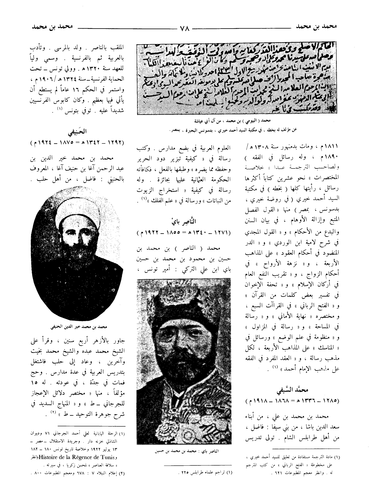 وHistoire de la Regence de Tunis وانظر (سلافة العناصر) لمحسن زكريا، في سيرته.
