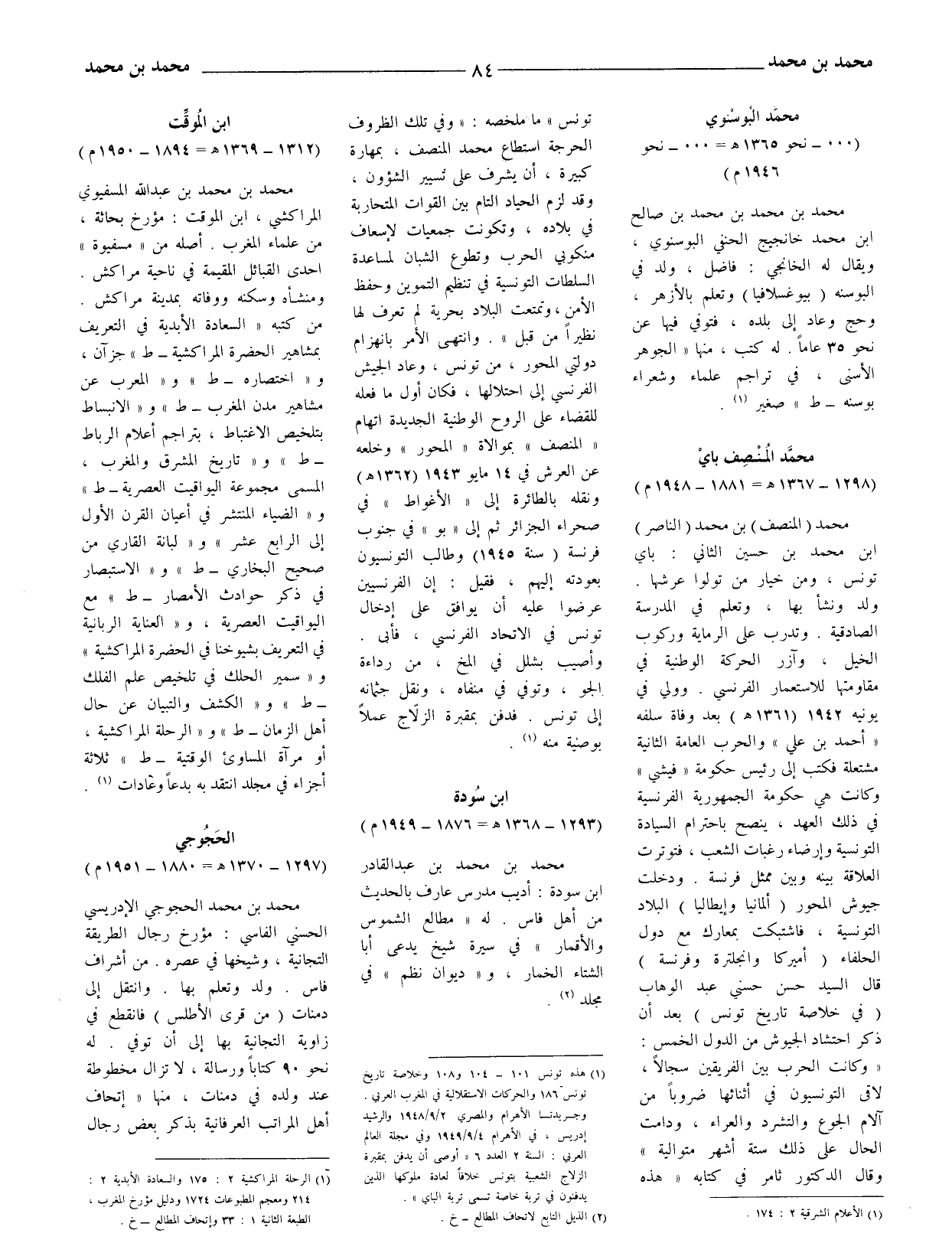 تونس) ما ملخصه: (وفي تلك الظروف الحرجة استطاع محمد المنصف، بمهارة كبيرة، أن يشرف على تسيير الشؤون، وقد لزم الحياد التام بين القوات المتحاربة في بلاده، وتكونت جمعيات لإسعاف منكوبي الحرب وتطوع الشبان لمساعدة السلطات التونسية في تنظيم التموين وحفظ الأمن، وتمتعت البلاد بحرية لم تعرف لها نظيرا من قبل) . وانتهى الأمر بانهزام دولتي المحور من تونس وعاد الجيش الفرنسي إلى احتلالها، فكان أول ما فعله للقضاء على الروح الوطنية الجديدة اتهام (المنصف) بموالاة (المحور) وخلعه عن العرش في 14 مايو 1943 (1362 هـ ونقله بالطائرة إلى (الأغواط) في صحراء الجزائر ثم إلى (بو) في جنوب فرنسة (سنة 1945) وطالب التونسيون بعودته إليهم، فقيل: إن الفرنسيين عرضوا عليه أن يوافق على إدخال تونس في الاتحاد الفرنسي، فأبى. وأصيب بشلل في المخ، من رداءة الجو. وتوفي في منفاة، ونقل جثمانه إلى تونس. فدفن بمقبرة الزلّاج عملا بوصية منه (1) .