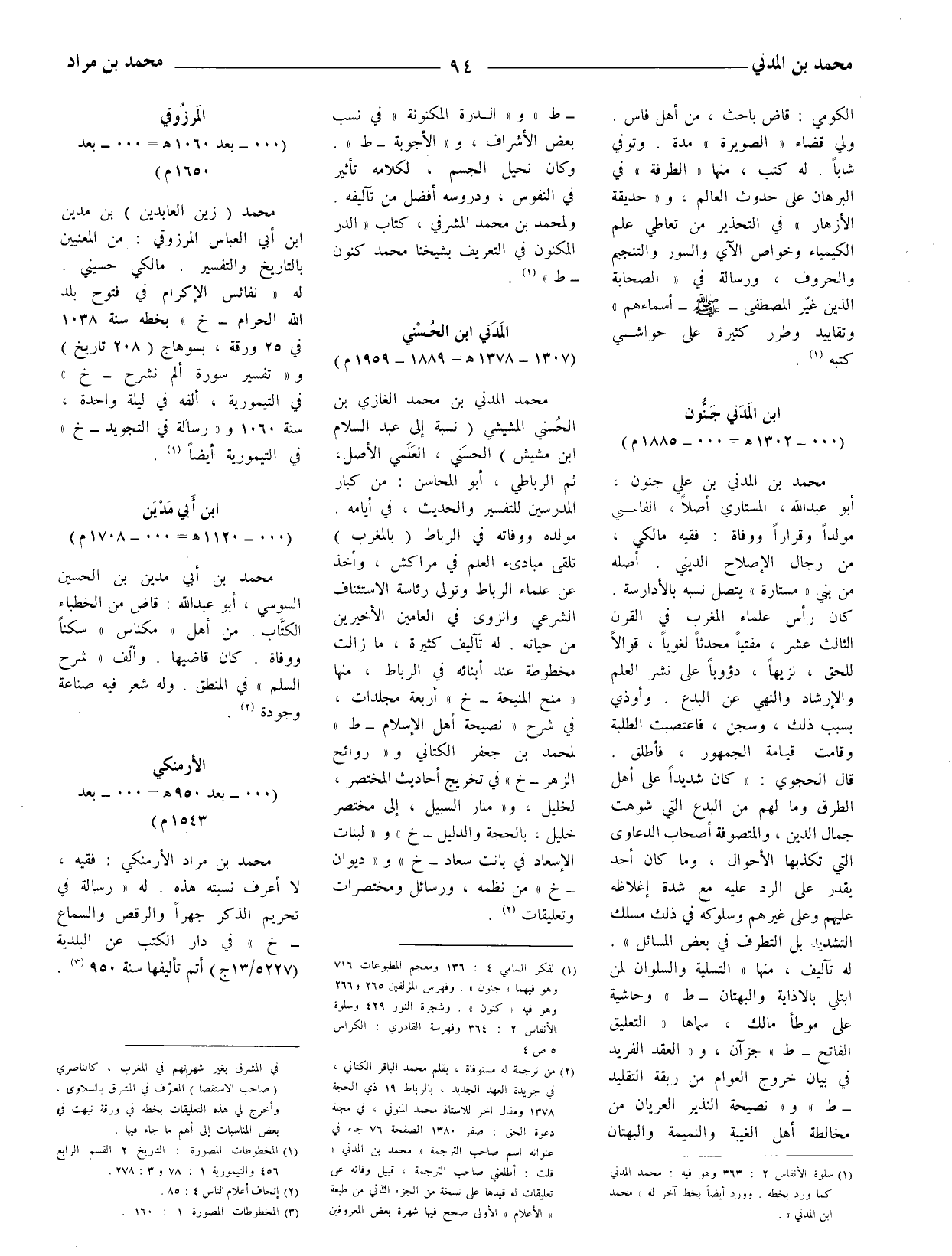 (2) من ترجمة له مستوفاة، بقلم محمد الباقر الكتاني، في جريدة العهد الجديد، بالرباط 19 ذي الحجة 1378 ومقال آخر للاستاذ محمد المنوني، في مجلة دعوة الحق: صفر 1380 الصفحة 76 جاء في عنوانه اسم صاحب الترجمة (محمَّد بن المدني) قلت: أطلعني صاحب الترجمة، قبيل وفاته على تعليقات له قيدها على نسخة من الجزء الثاني من طبعة (الأعلام) الأولى صحح فيها شهرة بعض المعروفين