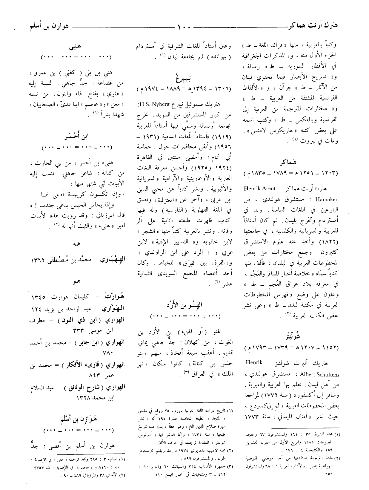 هنرك آرنت هماكر Henrik Arent: Hamaker مستشرق هولندي، من البارعين في اللغات السامية. ولد في أمستردام وتخرج بليدن. ثم كان أستاذا للعربية والسريانية والكلدانية، في جامعتها (1822) وأخذ عنه علوم الاستشراق كثيرون. وجمع مختارات من بعض المخطوطات العربية في البلدان، فألف منها كتابا سمّاه " خلاصة أخبار المسافر والعجم، في معرفة بلاد عراق العجم - ط " وعاون على وضع " فهرس المخطوطات العربية في مكتبة ليدن - ط " وعلى نشر بعض الكتب العربية (2) .