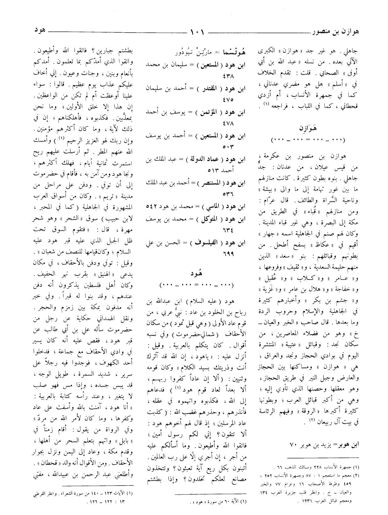 بَطَشْتُمْ جَبَّارِينَ؟ فَاتَّقُوا الله وَأَطِيعُونِ. وَاتَّقُوا الَّذِي أَمَدَّكُمْ بِما تَعْلَمُونَ. أَمَدَّكُمْ بِأَنْعامٍ " وَبَنِينَ، وَجَنَّاتٍ وَعُيُونٍ. إِنِّي أَخافُ عَلَيْكُمْ عَذابَ يَوْمٍ عَظِيمٍ. قالُوا: سَواءٌ عَلَيْنا أَوَعَظْتَ أَمْ لَمْ تَكُنْ من الْواعِظِينَ. إِنْ هذا إِلَّا خُلُقُ الْأَوَّلِينَ، وَما نَحْنُ بِمُعَذَّبِينَ. فَكَذَّبُوهُ، فَأَهْلَكْناهُمْ، إِنَّ في ذلِكَ لَآيَةً، وَما كانَ أَكْثَرُهُمْ مُؤْمِنِينَ. وَإِنَّ رَبَّكَ لَهُوَ الْعَزِيزُ الرَّحِيمُ (1) وأمسك الله عنهم المطر. ثم أرسلت عليهم ريح استمرت ثمانية أيام، فهلك أكثرهم، ونجا هود ومن آمن به، فأقام في حضرموت إلى أن توفي. ودفن على مراحل من مدينة " تريم ". وكان من أسواق العرب المشهورة في الجاهلية (كما في المحبر، لابن حبيب) سوق " الشحر " وهو شحر مهرة، قال: " فتقوم السوق تحت ظل الجبل الّذي عليه قبر هود عليه السلام، وكان قيامها للنصف من شعبان ". وقيل: توفي ودفن بالأحقاف، في مكان يدعى " الهنيق " بقرب نهر الحفيف. وكان أهل فلسطين يذكرون أنه دفن عندهم، وقد بنوا له قبرا. وفي خبر أنه مدفون بمكة بين زمزم والحجر. ونقل الهمدانيّ حكاية عن رجل من حضرموت سأله علي بن أبي طالب عن قبر هود، فقص عليه أنه كان يسير في وادي الأحقاف مع جماعة، فدخلوا أحد الكهوف، فوجدوا فيه رجلا على سرير، شديد السمرة، طويل الوجه، قد يبس جسده، وإذا مس فهو صلب لا يتغير، وعند رأسه كتابة بالعربية: " أنا هود، آمنت باللَّه وأسفت على عاد وكفرها، وما كان لأمر الله من مردّ " وفي الرواة من يقول: أقام زمنا في " بابل " واتهم بتعلم السحر من أهلها، وقدم مكة، وعاد إلى اليمن ونزل بجوار الأحقاف. ومن الأقوال أنه والد " قحطان ". وأطلعني عبد الرحمن بن عبيد الله، مفتي