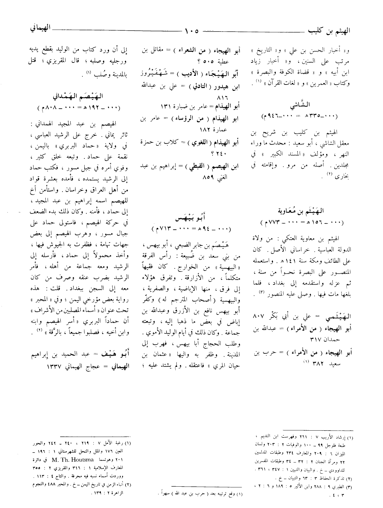 الهيصم بن عبد المجيد الهمدانيّ: ثائر يماني. خرج على الرشيد العباسي، في ولاية " حماد البربري " باليمن، نقمة على حماد. وتبعه خلق كثير، وقوي أمره في جبل مسور، فكتب حماد إلى الرشيد يستمده، فأمده بعشرة قواد من أهل العراق وخراسان. واستأمن أخ للهيصم اسمه إبراهيم بن عبد المجيد، إلى حماد، فأمنه. وكان ذلك بدء الضعف في حركة الهيصم، فاستولى حماد على جبال مسور، وهرب الهيصم إلى بعض جهات تهامة، فظفرت به الجيوش فيها، وأخذ محمولا إلى حماد، فأرسله إلى الرشيد ومعه جماعة من أهله، فأمر الرشيد بضرب عنقه وصرف من كان معه إلى السجن ببغداد. قلت: هذه رواية بعض مؤرخي اليمن، وفي " المحبر " تحت عنوان " أسماء المصلبين من الأشراف " إن حماداً البربري " أسر الهيصم وابنه وابن أخيه، فصلبوا جميعا، بالرَّقة " (2) .