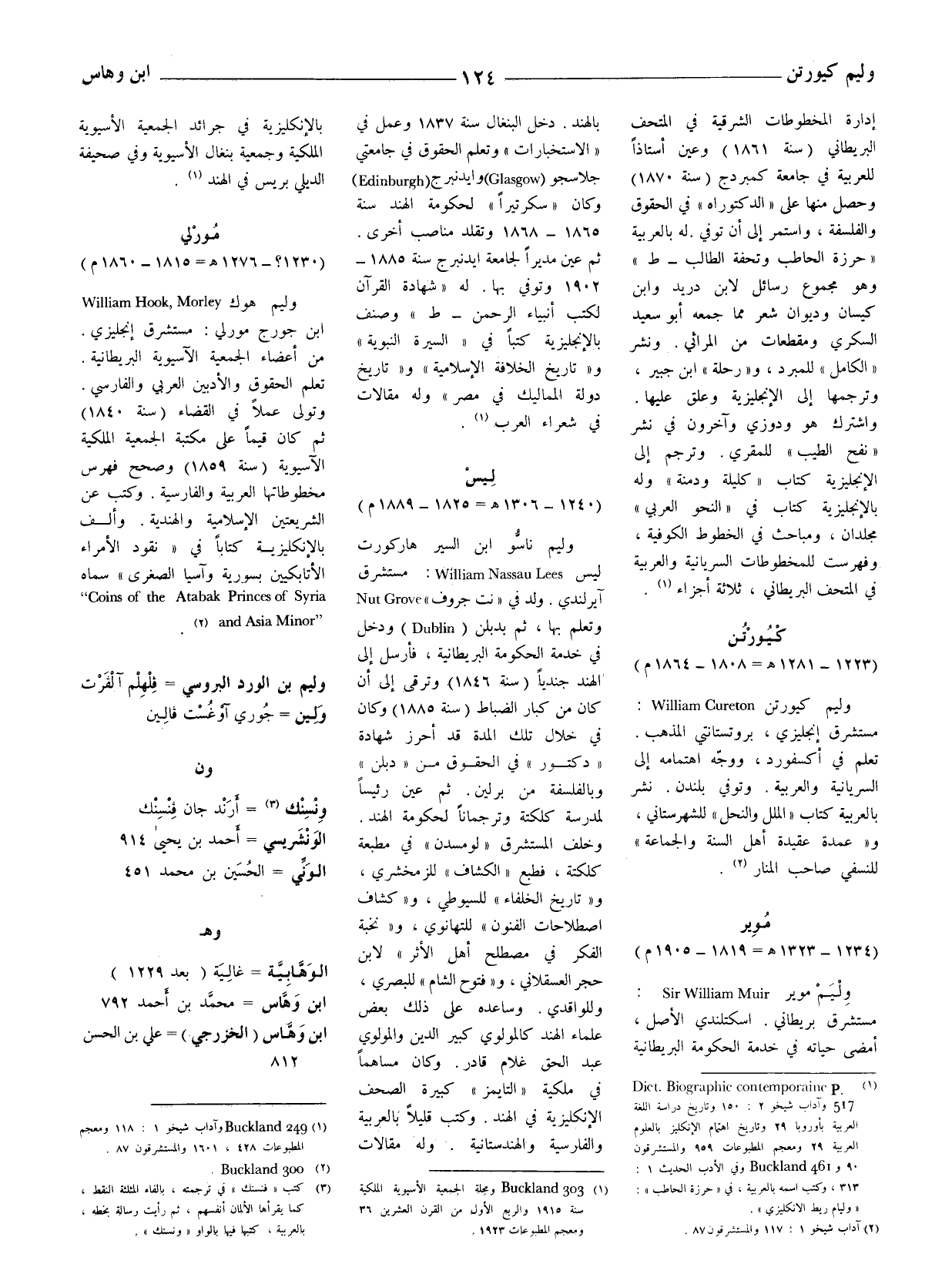 وليم هوك William Hook , Morley ابن جورج مورلي: مستشرق إنجليزي. من أعضاء الجمعية الآسيوية البريطانية. تعلم الحقوق والأدبين العربيّ والفارسيّ. وتولى عملا في القضاء (سنة 1840) ثم كان قيما على مكتبة الجمعية الملكية الآسيوية (سنة 1859) وصحح فهرس مخطوطاتها العربية والفارسية. وكتب عن الشريعتين الإسلامية والهندية. وألف بالإنكليزية كتاباُ في " نقود الأمراء الأتابكيين بسورية وآسيا الصغري " سماه