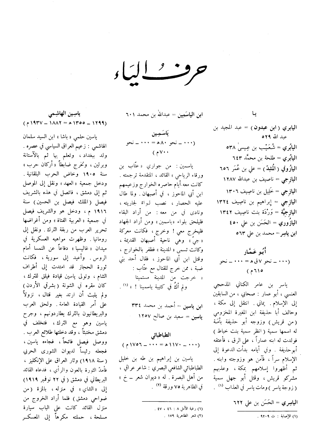 ياسين حلمي " باشا " ابن السيد سلمان الهاشمي: زعيم العراق السياسي في عصره. ولد ببغداد، وتعلم بها ثم بالآستانة وبرلين، وتخرج ضابطا " أركان حرب " سنة 1905 وخاض الحرب البلقانية. ودخل جمعية " العهد " ونقل إلى الموصل ثم إلى دمشق، فاتصل في هذه بالشريف فيصل (الملك فيصل بن الحسين) سنة 1916 م، ودخل هو والشريف فيصل في جمعية " العربية الفتاة " ومن أغراضها تحرير العرب من ربقة الترك. ونقل إلى رومانيا. وظهرت مواهبه العسكرية في ميدان " غاليسيا " دفاعا عن النمسا أمام الروس. وأعيد إلى سورية، فكانت ثورة الحجاز قد امتدت إلى أطراف الشام، وتولى ياسين قيادة فيلق للترك، كان مقره في الشونة (بشرقي الأردن) ولم يلبث أن ارتد بغير قتال، نزولا على أمر القيادة العامة. ولحق العرب والبريطانيون بالترك يطاردونهم، وجرح ياسين وهو مع الترك، فتخلف في دمشق مختبئا، وقد دخلتها طلائع العرب.