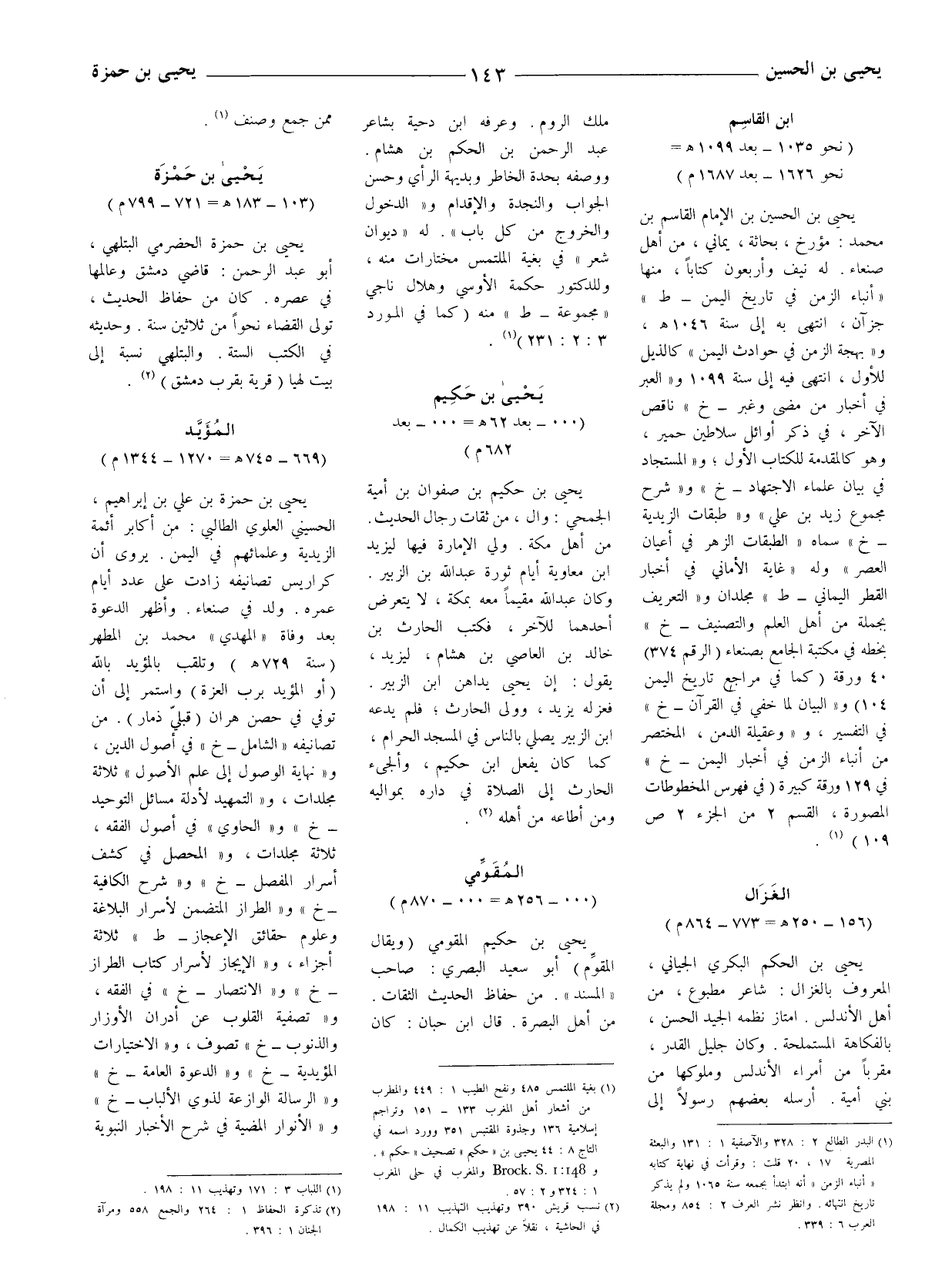 (1) بغية الملتمس 485 ونفح الطيب 1: 449 والمطرب من أشعار أهل المغرب 133 - 151 وتراجم إسلامية 136 وجذوة المقتبس 351 وورد اسمه في التاج 8: 44 يحيى بن " حكيم " تصحيف " حكم ". و 148: 1Brock S. والمغرب في حلى المغرب 1: 324 و 2: 57.