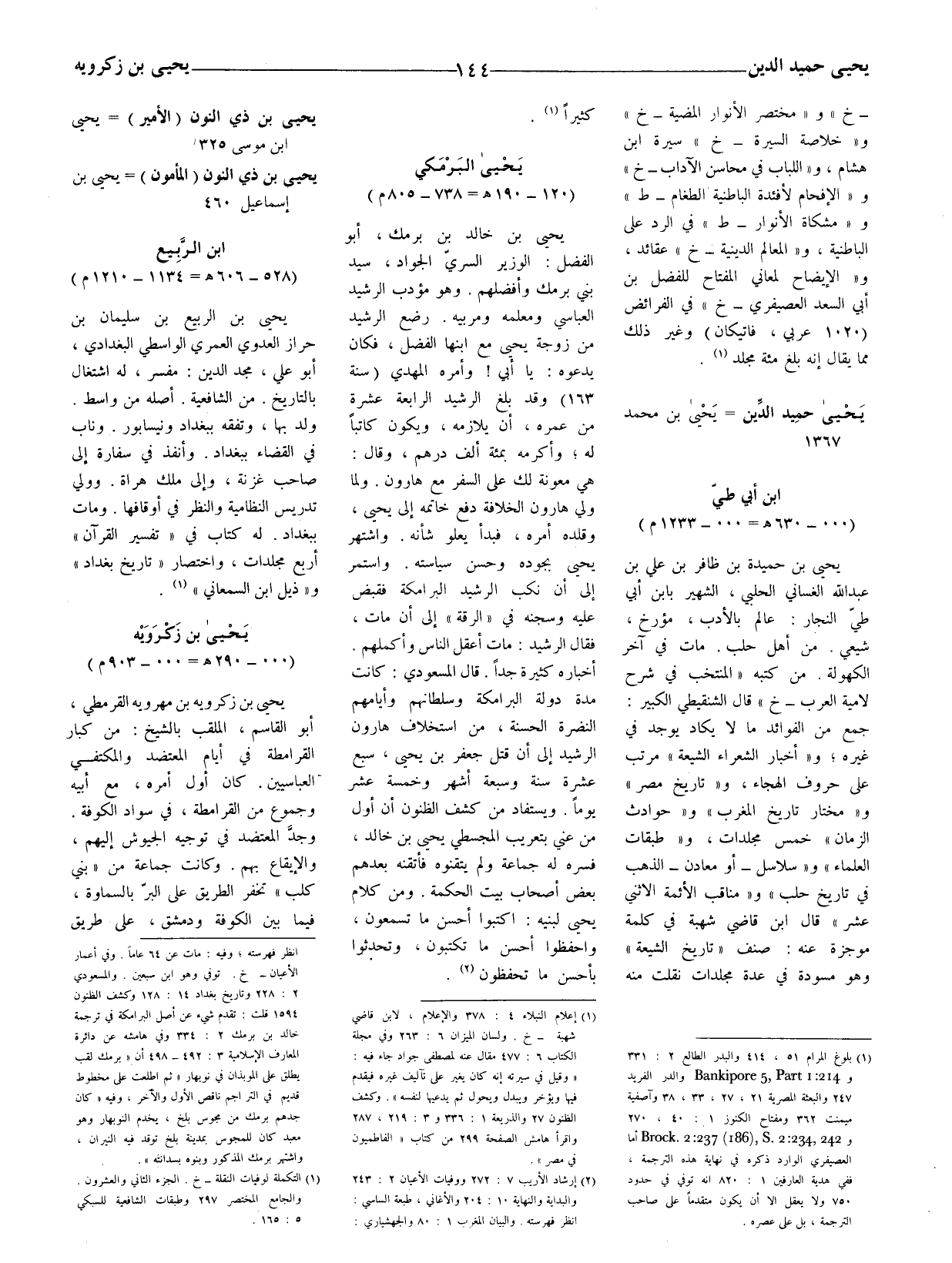 والمسعودي 2: 228 وتاريخ بغداد 14: 128 وكشف الظنون 1594 قلت: تقدم شئ عن أصل البرامكة في ترجمة خالد بن برمك 2: 334 وفي هامشه عن دائرة المعارف الإسلامية 3: 492 - 498 إن " برمك لقب يطلق على الموبذان في نوبهار " ثم اطلعت على مخطوط قيم في التراجم ناقص الأول والآخر، وفيه " كان جدهم برمك من مجوس بلخ، يخدم النوبهار وهو معبد كان للمجوس بمدينة بلخ توقد فيه النيران، واشتهر برمك المذكور وبنوه بسدانته ".