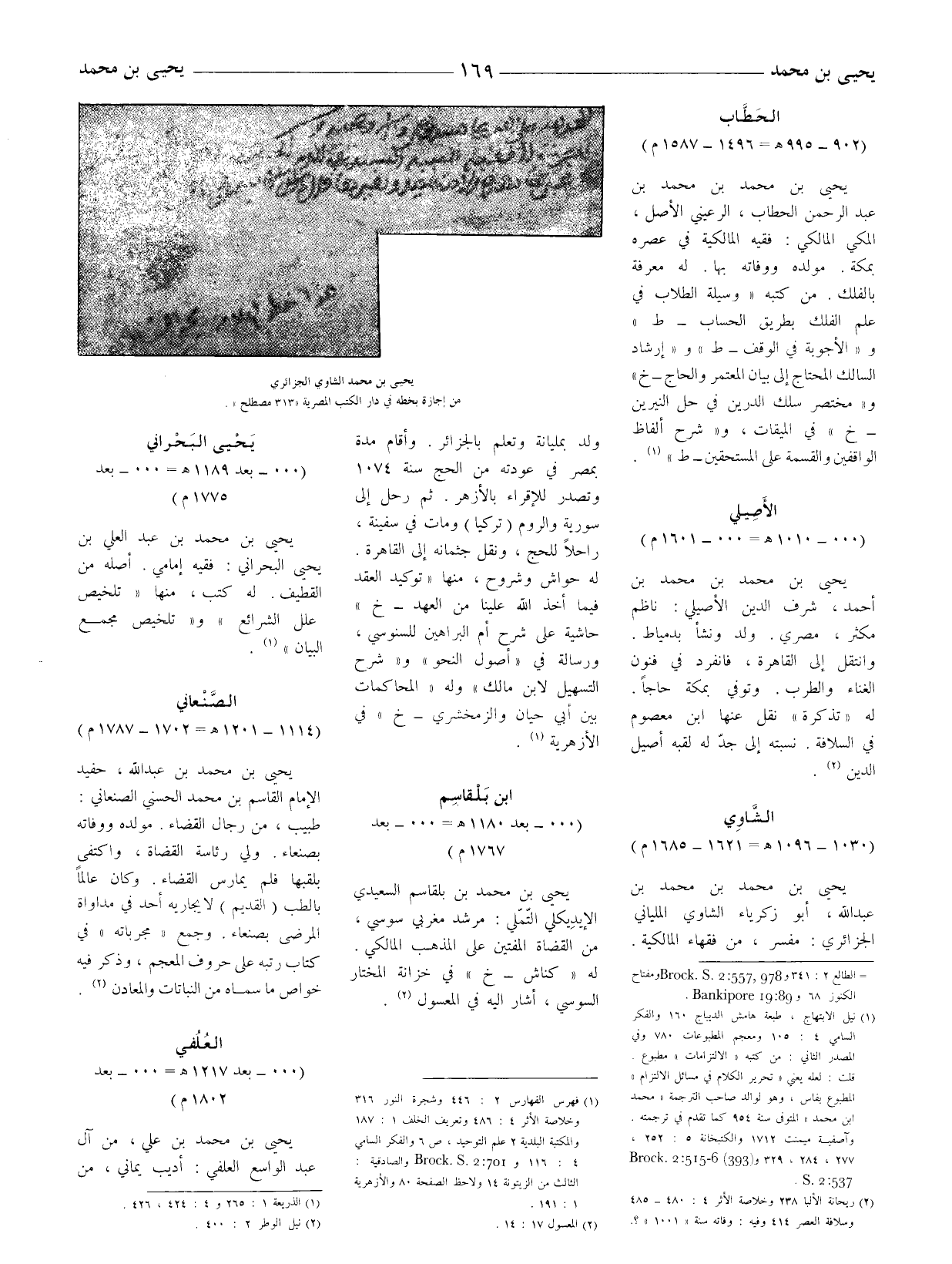 (1) نيل الابتهاج، طبعة هامش الديباج 160 والفكر السامي 4: 105 ومعجم المطبوعات 780 وفي المصدر الثاني: من كتبه " الالتزامات " مطبوع. قلت: لعله يعني " تحرير الكلام في مسائل الالتزام " المطبوع بفاس، وهو لوالد صاحب الترجمة " محمَّد ابن محمد " المتوفى سنة 954 كما تقدم في ترجمته. وآصفية ميمنت 1712 والكتبخانة 5: 252، 277، 284، 329 و S 2: 537 (393) 6 - 515: 2Brock