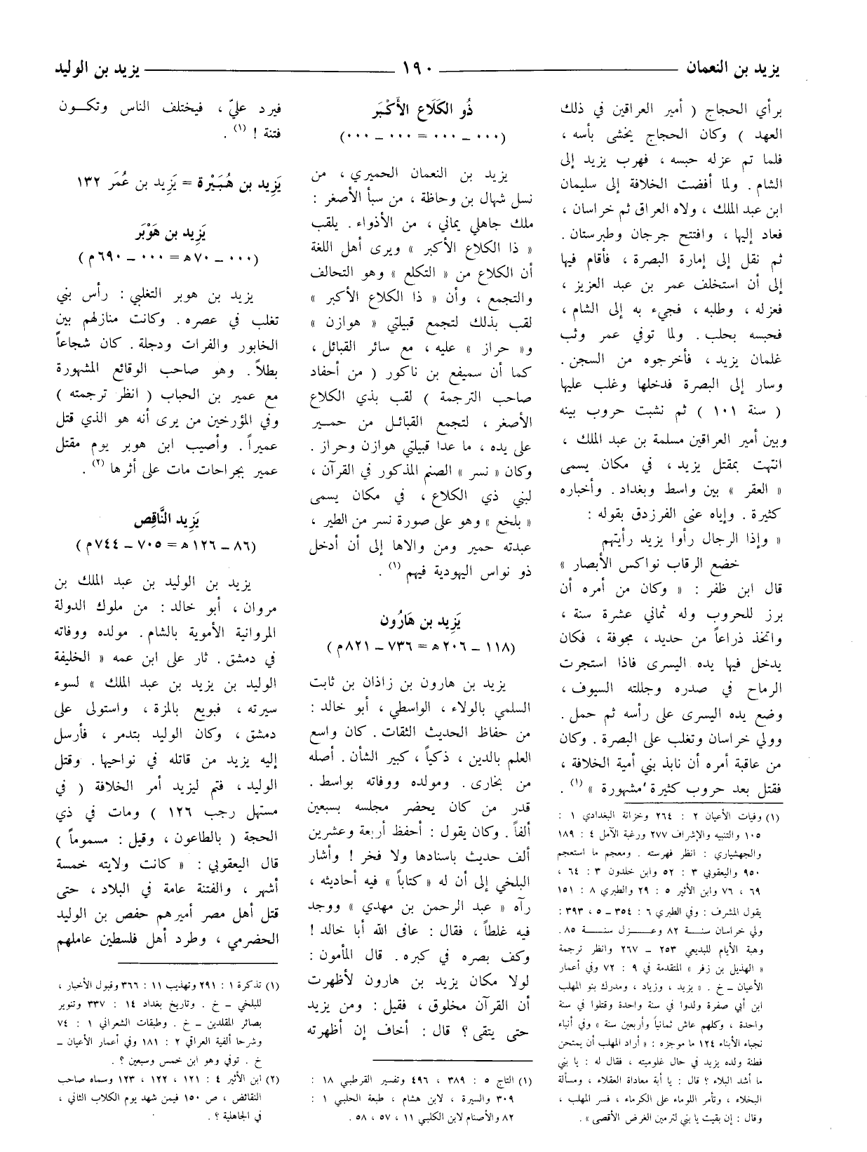(1) وفيات الأعيان 2: 264 وخزانة البغدادي 1: 105 والتنبيه والإشراف 277 ورغبة الآمل 4: 189 والجهشياري: انظر فهرسته. ومعجم ما استعجم 950 واليعقوبي 3: 52 وابن خلدون 3: 64، 69، 76 وابن الأثير 5: 29 والطبري 8: 151 يقول المشرف: وفي الطبري 6: 354 - 5، 393: ولي خراسان سنة 82 وعزل سنة 85. وهبة الأيام للبديعي 253 - 267 وانظر ترجمة " الهذيل بن زفر " المتقدمة في 9: 72 وفي أعمار الأعيان - خ. " يزيد، وزياد، ومدرك بنو المهلب ابن أبي صفرة ولدوا في سنة واحدة وقتلوا في سنة واحدة، وكلهم عاش ثمانيا وأربعين سنة " وفي أنباء نجباء الأبناء 124 ما موجزه: " أراد المهلب أن يمتحن فطنة ولده يزيد في حال غلوميته، فقال له: يا بني ما أشد البلاء؟ قال: يا أبة معاداة العقلاء، ومسألة البخلاء، وتأمر اللوماء على الكرماء، فسر المهلب، وقال: إن بقيت يا بني لترمين الغرض الأقصى ".