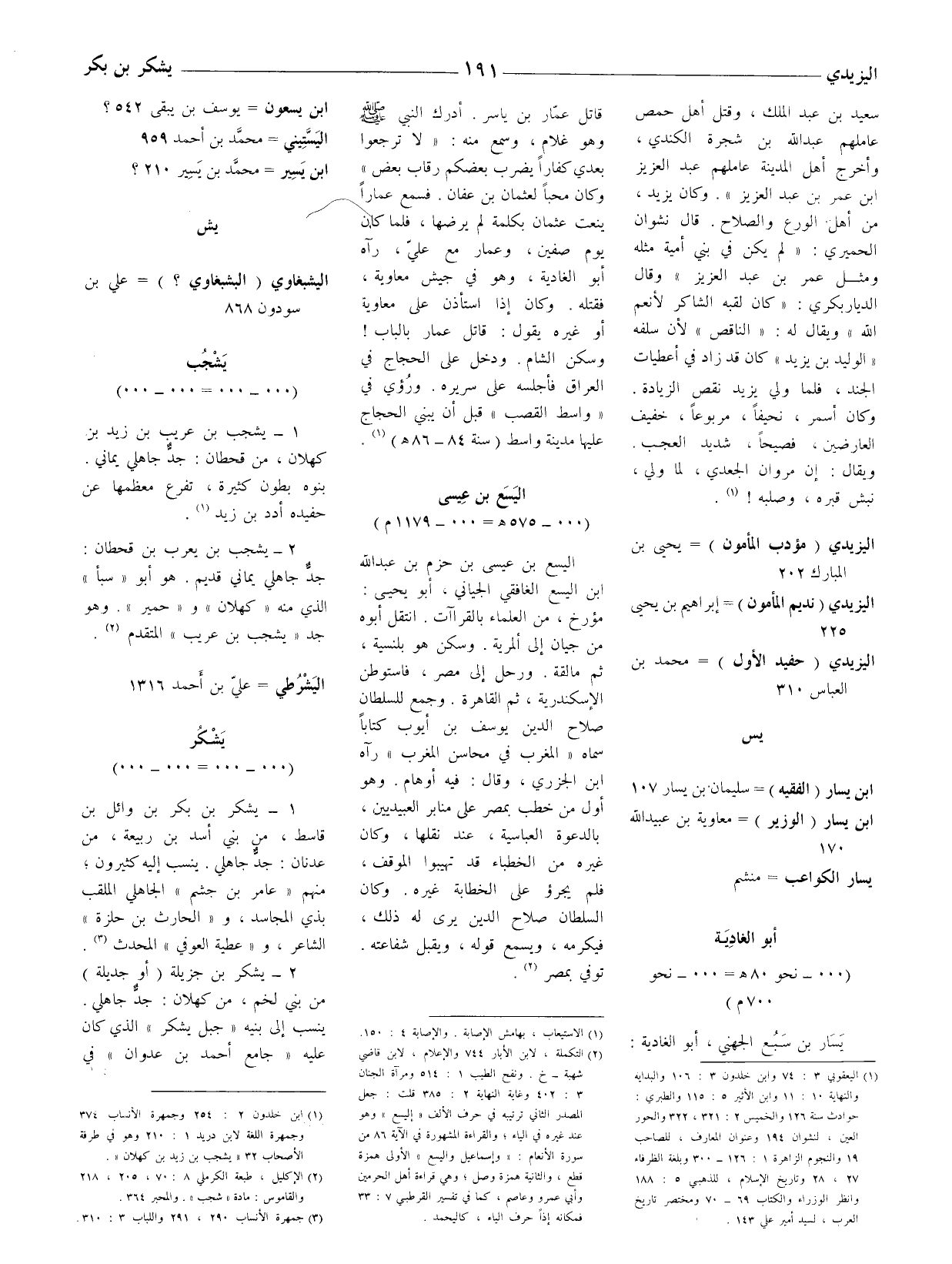 1 - يشكر بن بكر بن وائل بن قاسط، من بني أسد بن ربيعة، من عدنان: جدّ جاهلي. ينسب إليه كثيرون، منهم " عامر بن جشم " الجاهلي الملقب بذي المجاسد، و " الحارث بن حلزة " الشاعر، و " عطية العوفيّ " المحدث (3) .