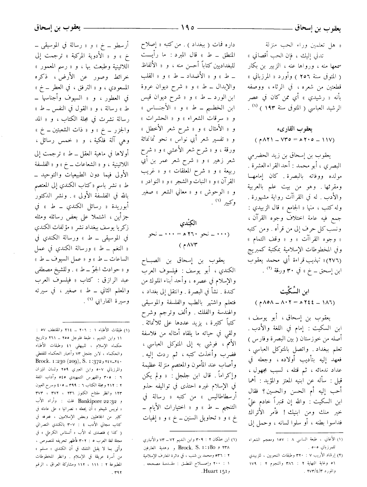 (1) ابن خلكان 2: 309 وابن النديم 72 - 73 والأنباري 238 و 180: 1 Brock S.
