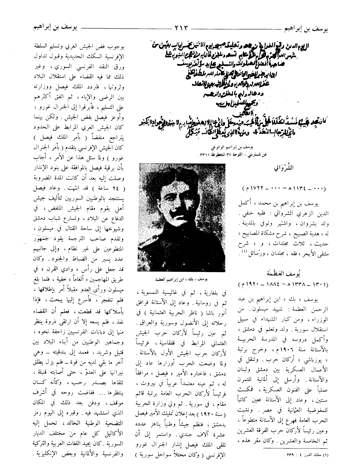 بوجوب فض الجيش العربيّ وتسليم السلطة الإفرنسية السكك الحديدية وقبول تداول ورق النقد الفرنسي السوري وغير ذلك مما فيه القضاء على استقلال البلاد وثروتها، فتردد الملك فيصل ووزارته بين الرضى والإباء، ثم اتفق أكثرهم على التسليم، فأبرقوا إلى الجنرال غورو، وأوعز فيصل بفض الجيش. ولكن بينما كان الجيش العربيّ المرابط على الحدود يتراجع منفضا (بأمر الملك فيصل) كان الجيش الإفرنسي يتقدم (بأمر الجنرال غورو) ولما سئل هذا عن الأمر، أجاب بأن برقية فيصل بالموافقة على بنود الإنذار وصلت إليه بعد أن كانت المدة المضروبة (24 ساعة) قد انتهت. وعاد فيصل يستنجد بالوطنيين السوريين لتأليف جيش أهلي يقوم مقام الجيش المنفض، في الدفاع عن البلاد، وتسارع شباب دمشق وشيوخها إلى ساحة القتال في ميسلون، وتقدم صاحب الترجمة يقود جمهور المتطوعين على غير نظام، وإلى جانبهم عدد يسير من الضباط والجنود. وكان قد جعل على رأس " وادي القرن " في طريق المهاجمين " ألغاما " خفية، فلما بلغ ميسلون ورأى العدو مقبلا أمر بإطلاقها، فلم تنفجر، فأسرع إليها يبحث، فإذا بأسلاكها قد قطعت، فعلم أن القضاء نفذ، فلم يسعه إلا أن ارتقى ذروة ينظر منها إلى دبابات الفرنسيين زاحفة نحوه، وجماهير الوطنيين من أبناء البلاد بين قتيل وشريد، فعمد إلى بندقيته - وهي آخر ما بقي لديه من قوة - فلم يزل يطلق نيرانها على العدوّ، حتى أصابته قنبلة، تلقاها بصدر رحب، وكأنه كان ينتظرها..ففاضت روحه في أشرف موقف، ودفن بعد ذلك في المكان الذي اشتهد فيه. وقبره إلى اليوم رمز التضحية الوطنية الخالد، تحمل إليه الأكاليل كل عام من مختلف الديار السورية. كان يجيد اللغات العربية والتركية والفرنسية والألمانية وبعض الأنكليزية.
