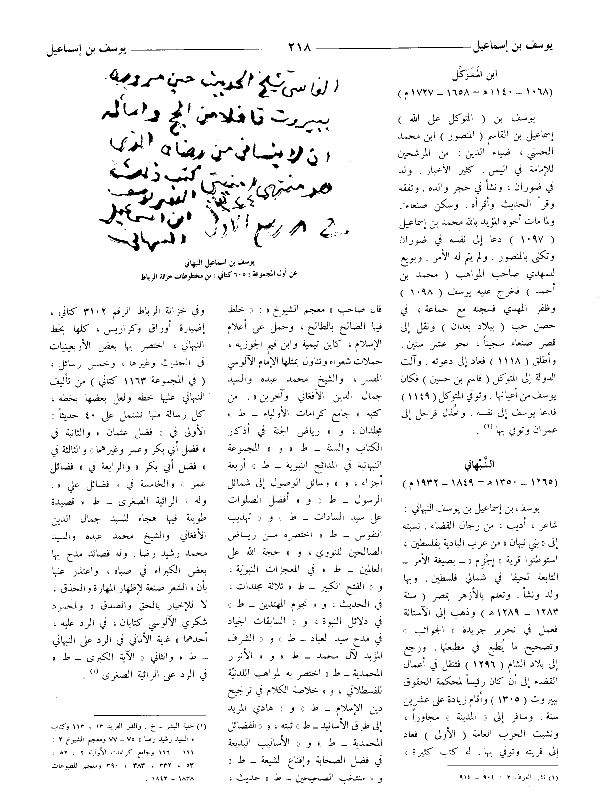 يوسف بن إسماعيل بن يوسف النبهاني: شاعر، أديب، من رجال القضاء. نسبته إلى " بني نبهان " من عرب البادية بفلسطين، استوطنوا قرية " إجْزِم " - بصيغة الأمر - التابعة لحيفا في شمالي فلسطين. وبها ولد ونشأ. وتعلم بالأزهر بمصر (سنة 1283 - 1289 م) وذهب إلى الآستانة