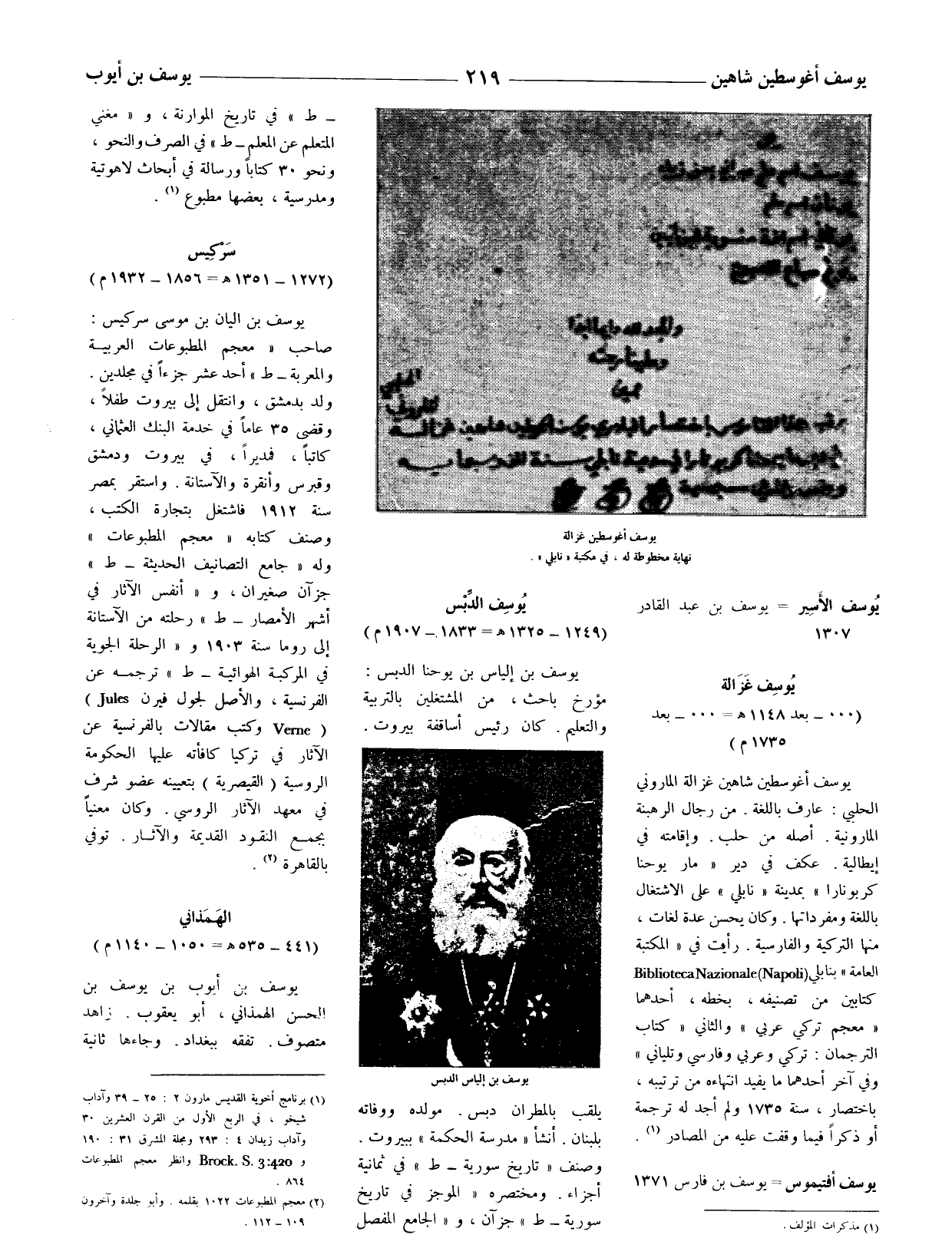 يوسف بن اليان بن موسى سركيس: صاحب " معجم المطبوعات العربية والمعربة - ط " أحد عشر جزءا في مجلدين. ولد بدمشق، وانتقل إلى بيروت طفلا، وقضى 35 عاما في خدمة البنك العثماني، كاتبا، فمديرا، في بيروت ودمشق وقبرس وأنقرة والآستانة. واستقر بمصر سنة 1912 فاشتغل بتجارة الكتب، وصنف كتابه " معجم المطبوعات " وله " جامع التصانيف الحديثة - ط "